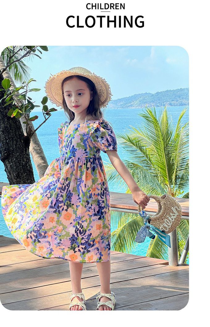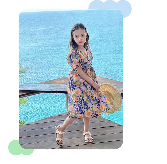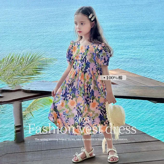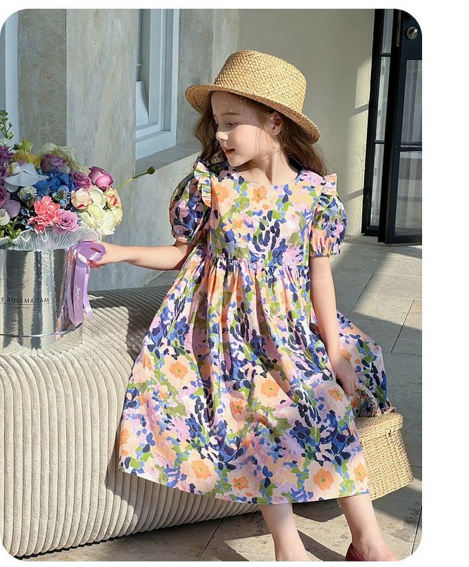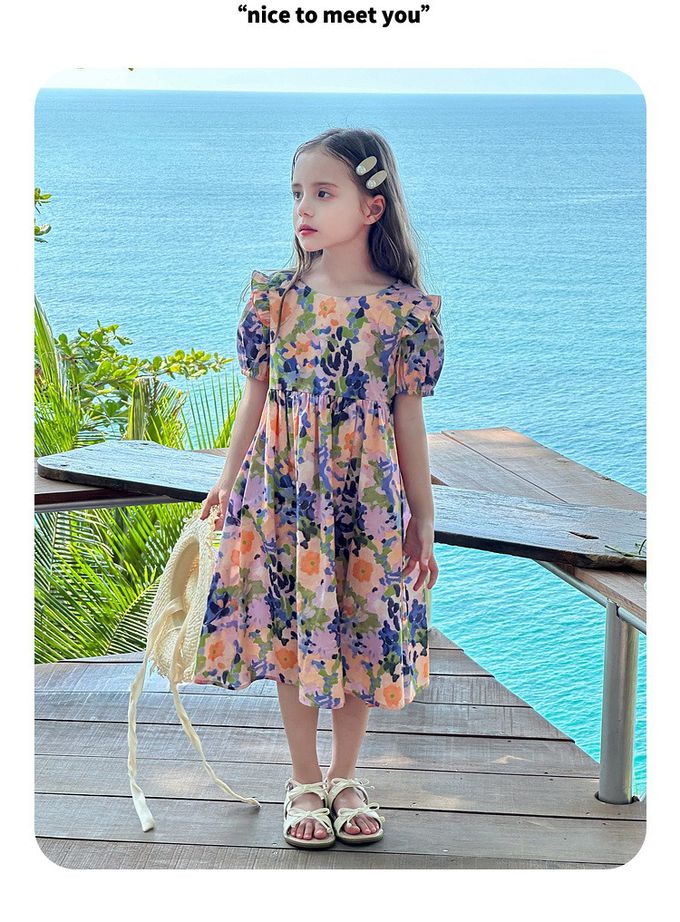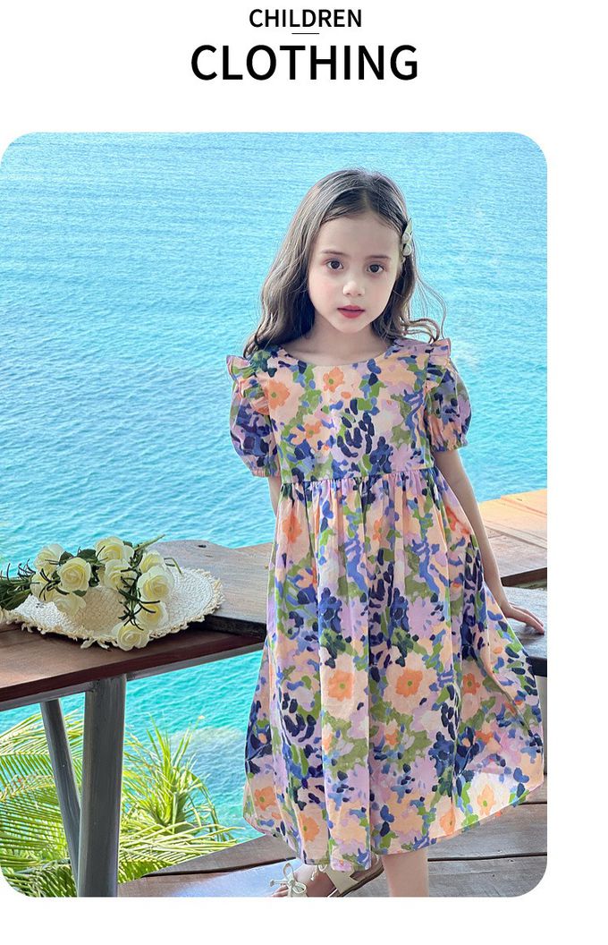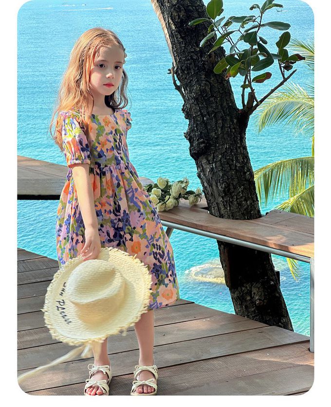 純棉法式浪漫小包袖洋裝-印花-粉紫色