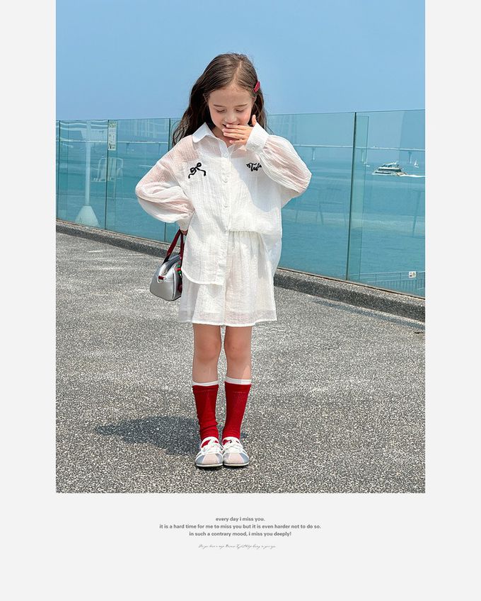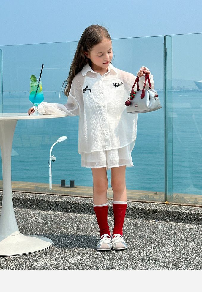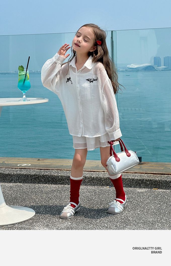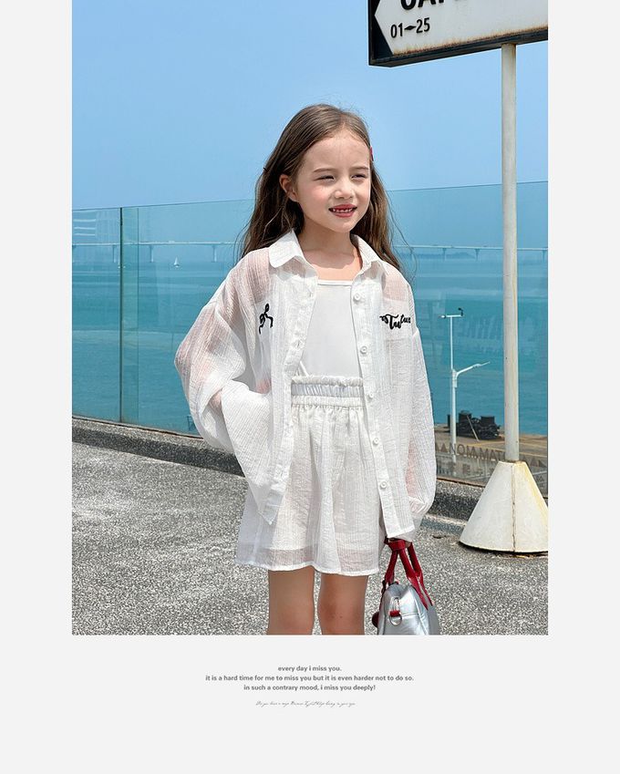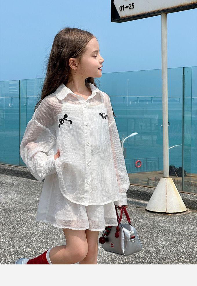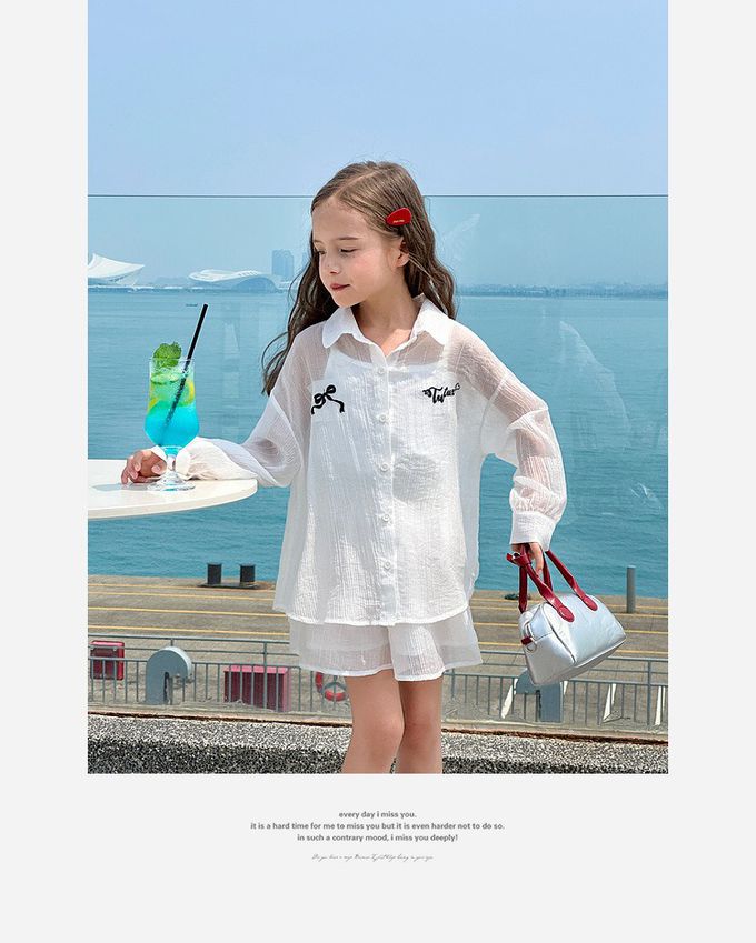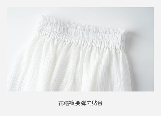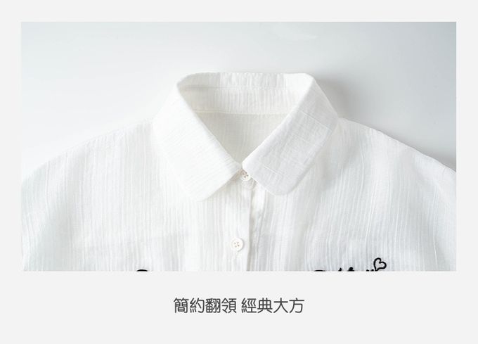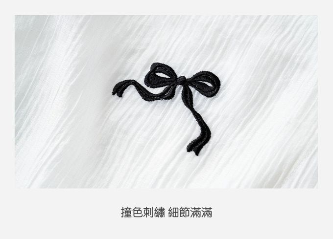 天絲透膚皺摺設計襯衫+短褲套裝-撞色刺繡-白色