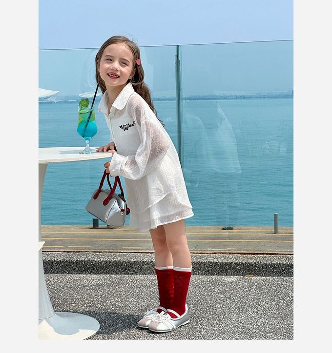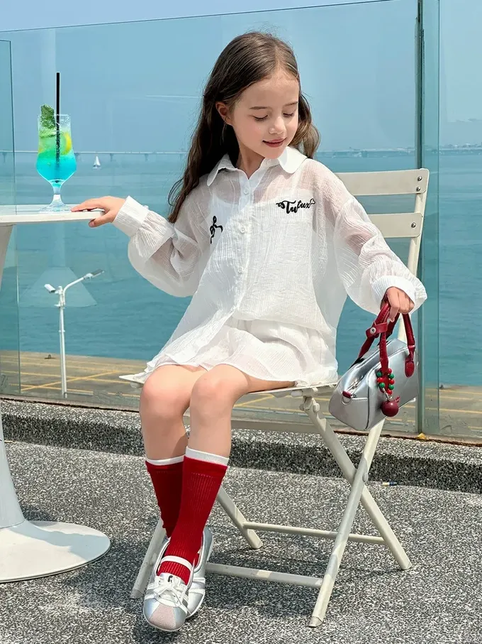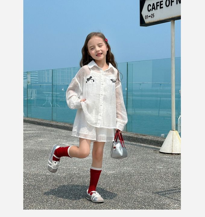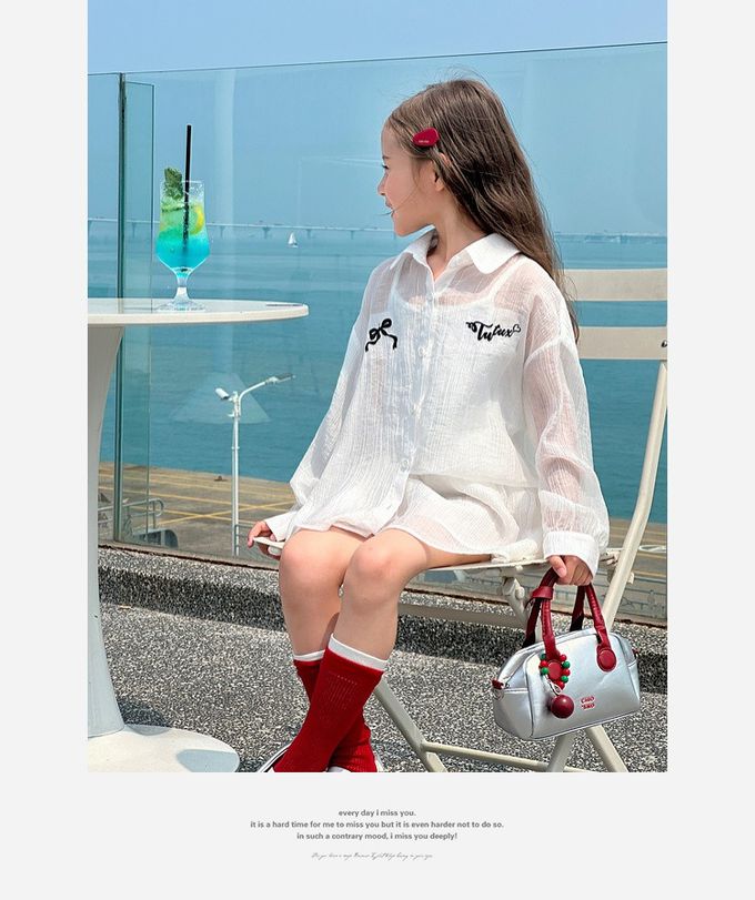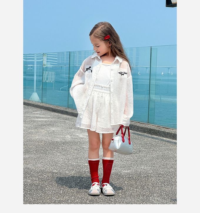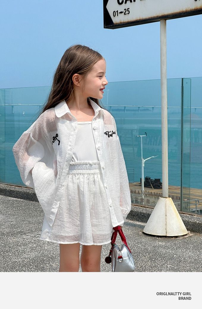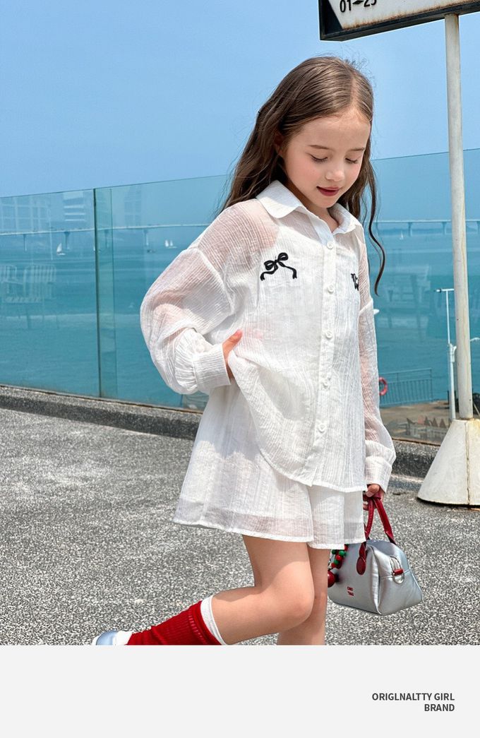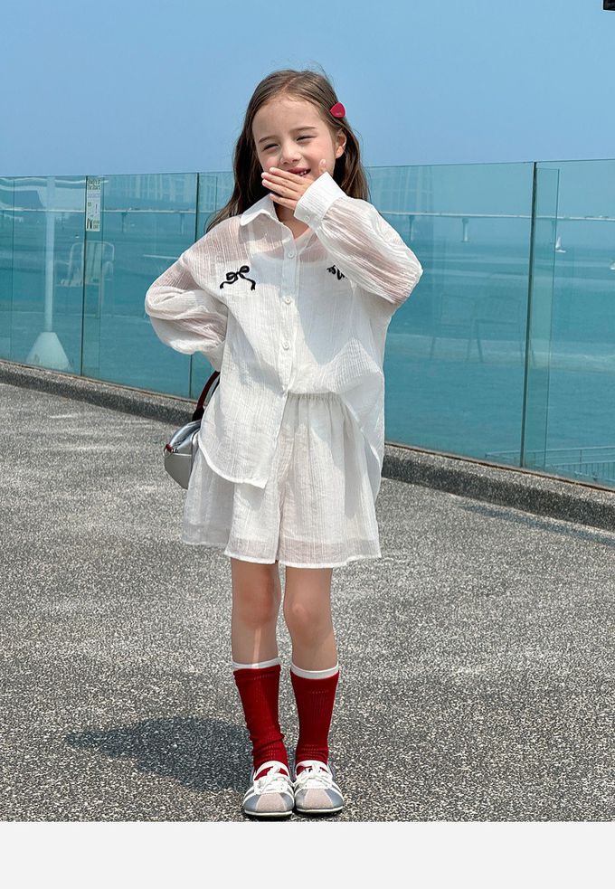 天絲透膚皺摺設計襯衫+短褲套裝-撞色刺繡-白色