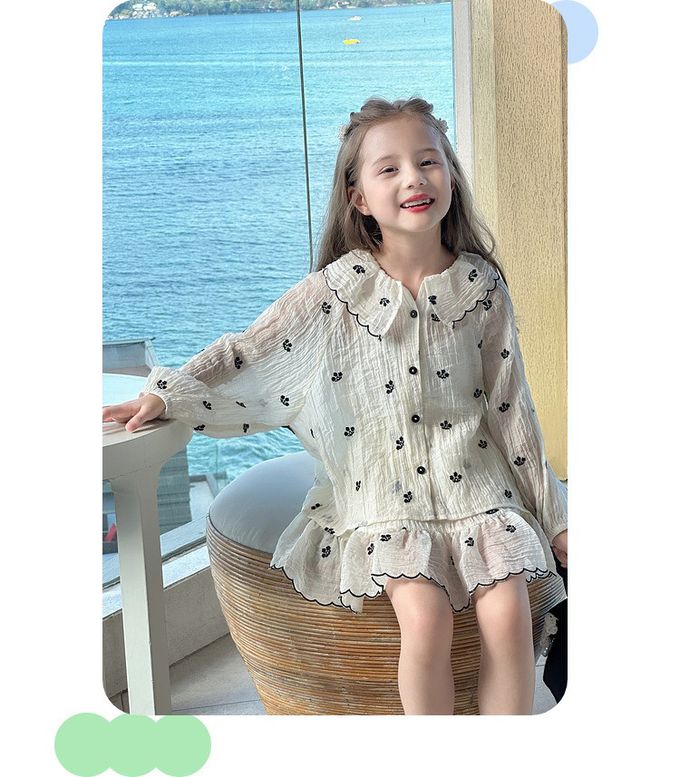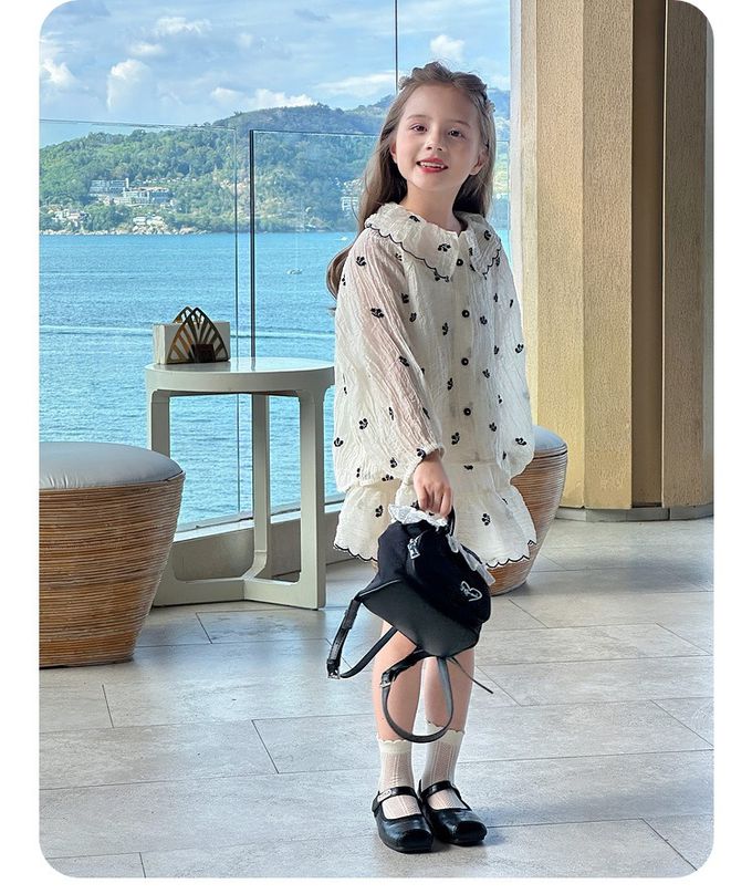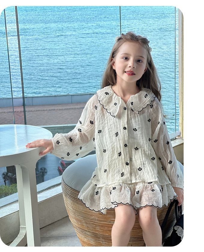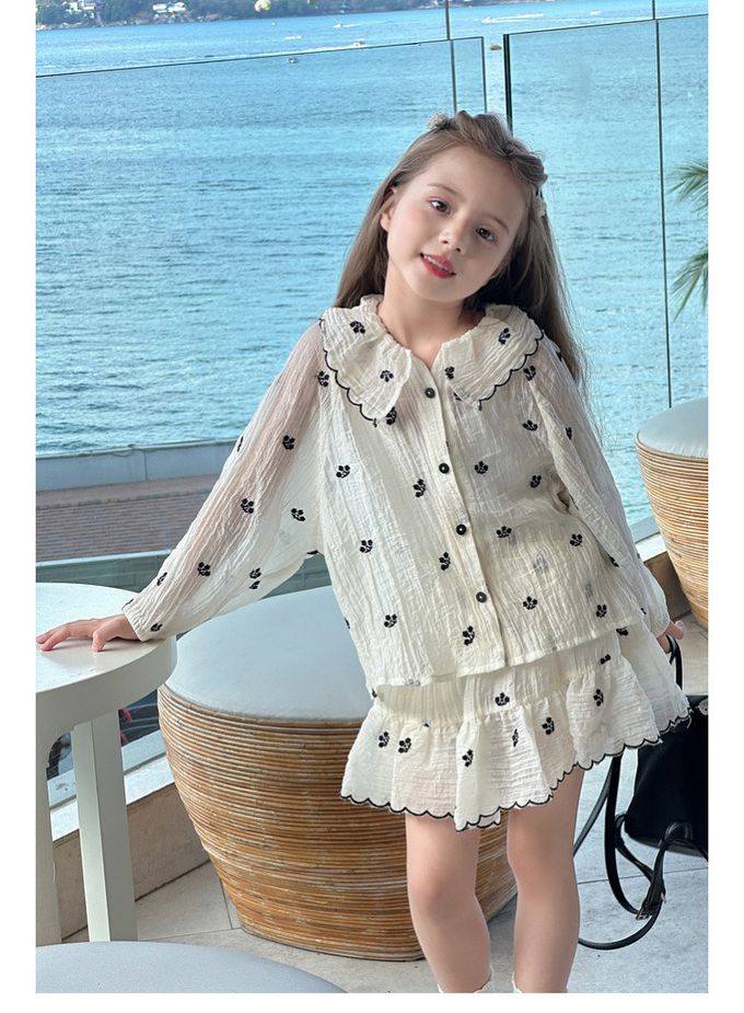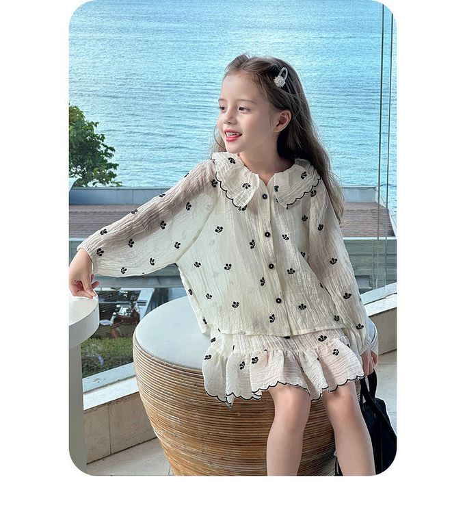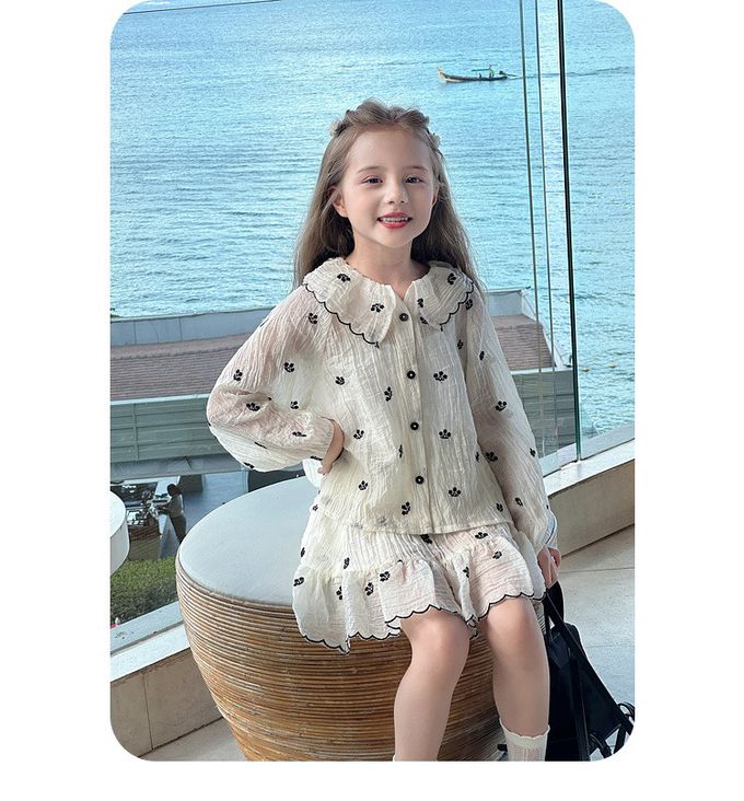 天絲透膚皺摺設計襯衫+短裙套裝-花邊刺繡-杏色