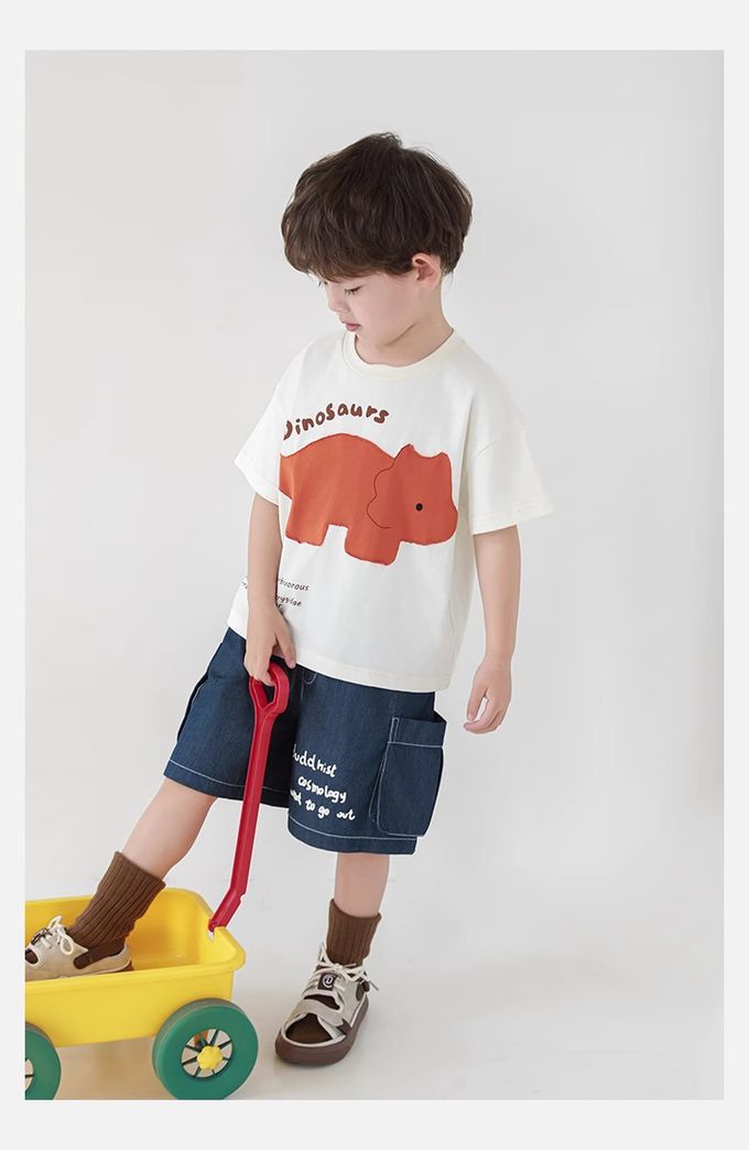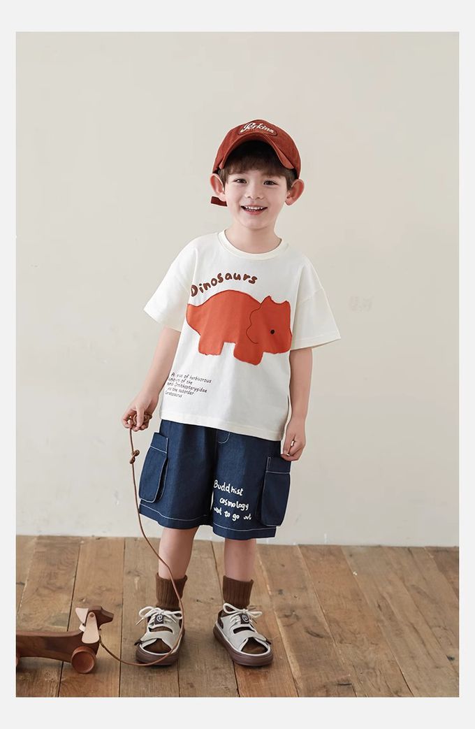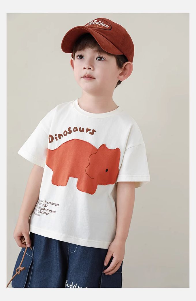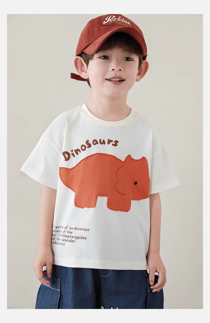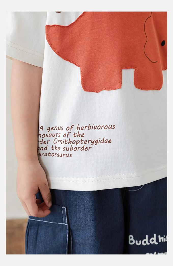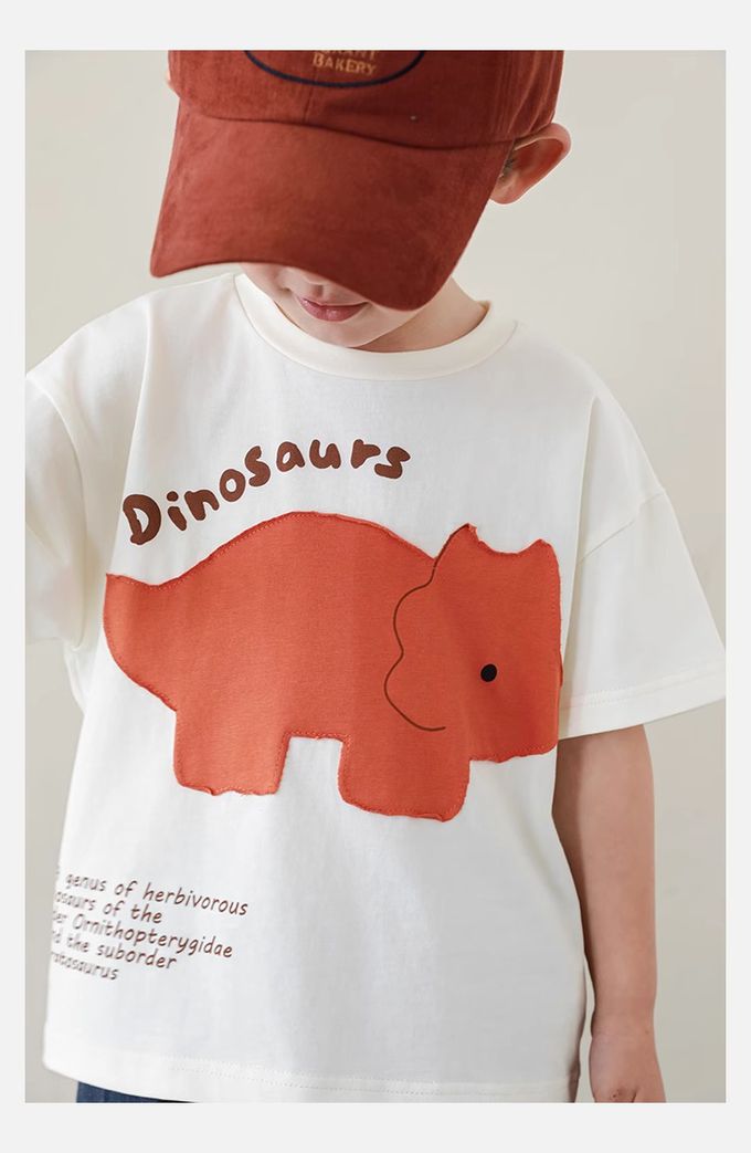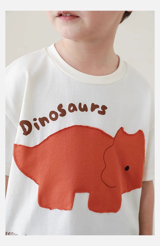 純棉圓領休閒短袖上衣-恐龍貼布繡-米白