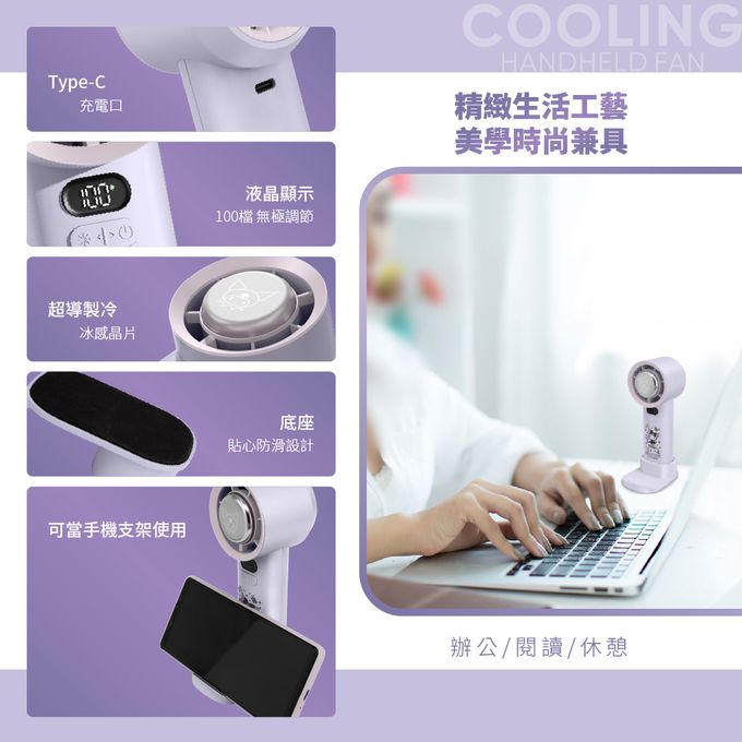 俏皮可愛的KUROMI 酷洛米冰風扇登場!100檔無極風速快速調整,搭配手機支架底座,辦公室/用餐追劇都方便!