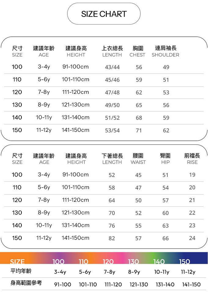2. 尺寸表乃依平均值制定,每位孩童發育情形不同,請參考模特試穿資訊、並依實際測量結果為準。