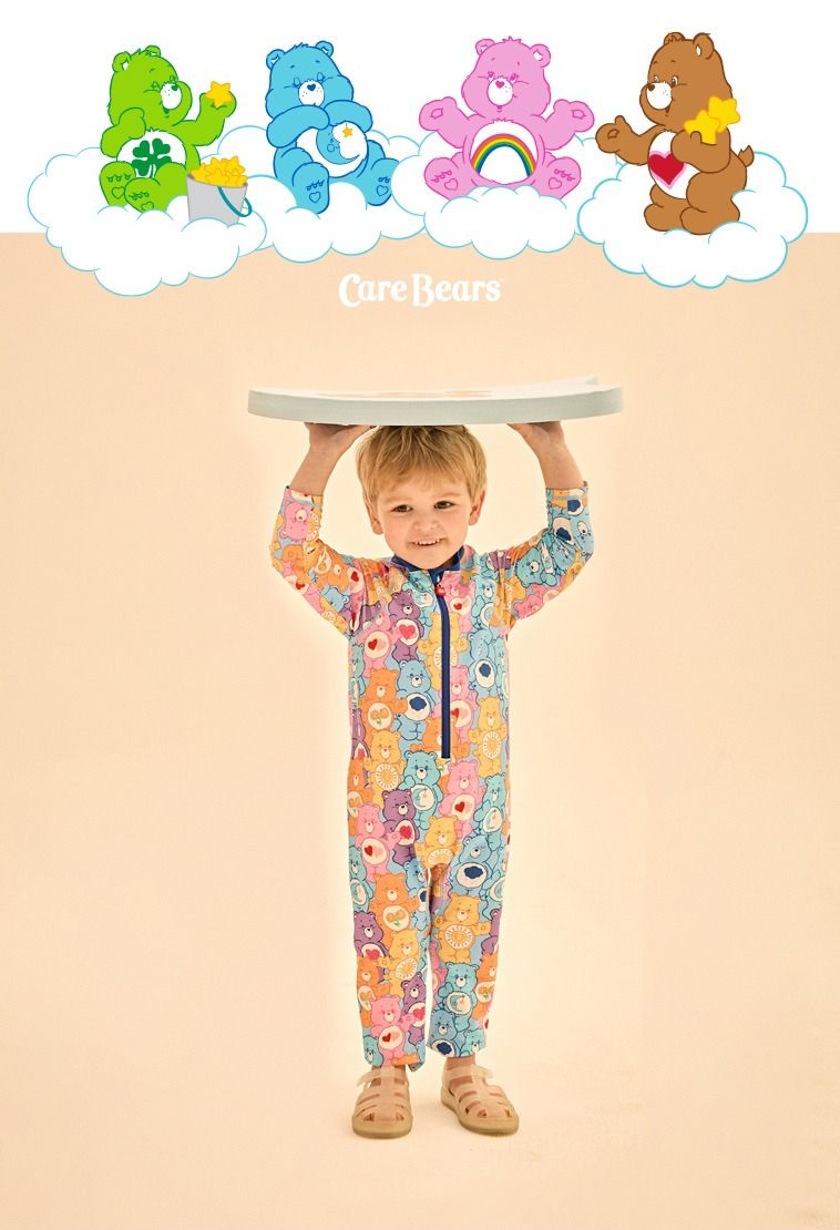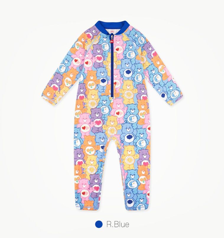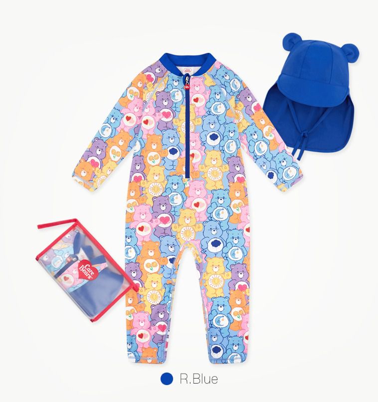 韓國 Care Bears - UPF 50+連身式長袖泳裝(附遮脖泳帽)-卡通人物滿版彩虹熊