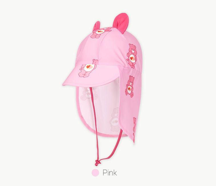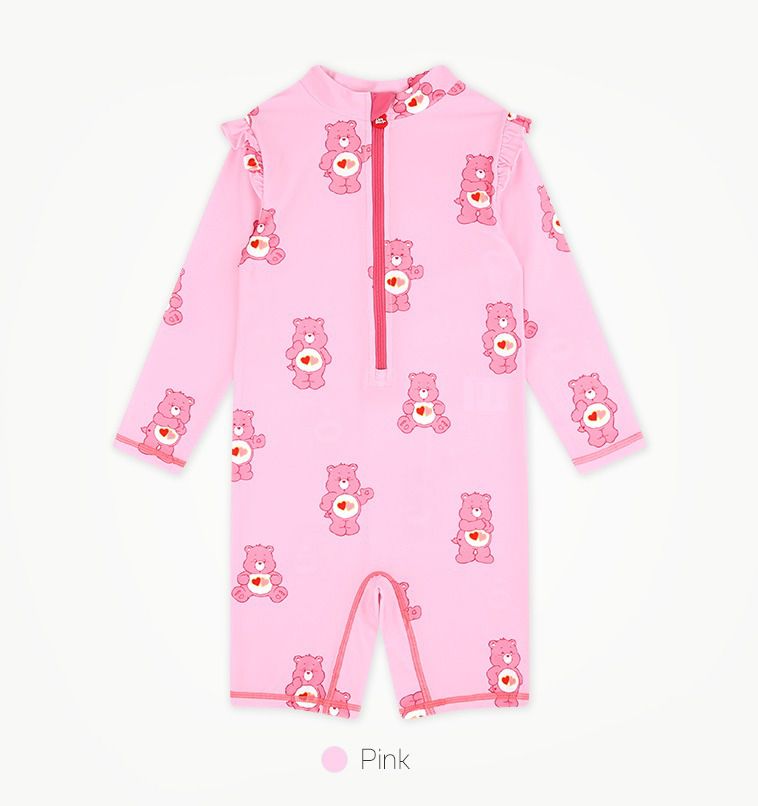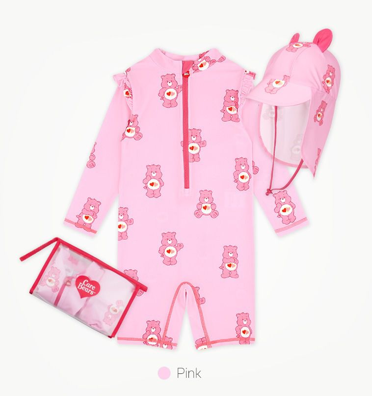 韓國 Care Bears - UPF 50+連身式長袖短褲泳裝(附遮脖泳帽)-卡通人物彩虹熊-粉