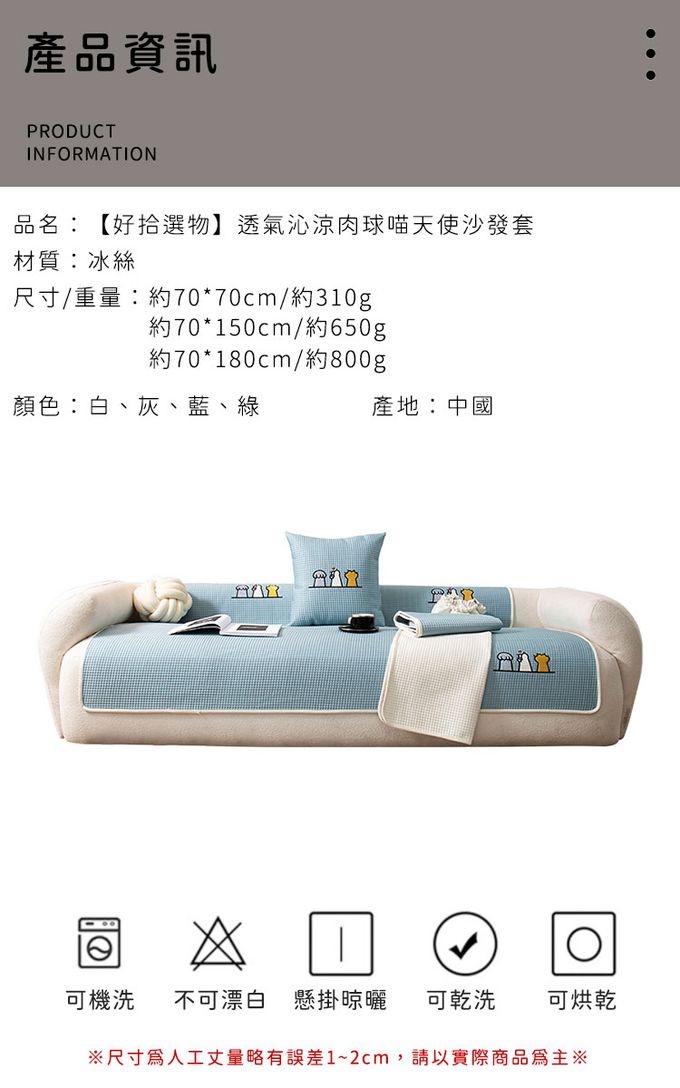 注意事項:1.商品到貨享鑑賞期之權益,鑑賞期並非試用期,辦理退貨商品必須是全新狀態且紙箱及商品配件包裝須完整。商品一經使用或組裝後,恕無法辦理退換貨。 2.商品為人工丈量略有1~3公分內誤差,請以實品為主。 3.網頁商品會因面板螢幕解析度不同,造成圖片顏色呈現略有不同,請以實品顏色為準。 4.商品圖為情境示意圖,本商品內容不包含擺飾物品。 5.請使用中性洗劑,避免使用漂白水、強鹼性清潔劑造成變色。 6.可機洗,建議使用洗衣袋(減少拉扯、起毛球)。 7.建議低溫烘乾,減少變形破壞纖維。 8.請勿接近火源以免造成商品毀損。