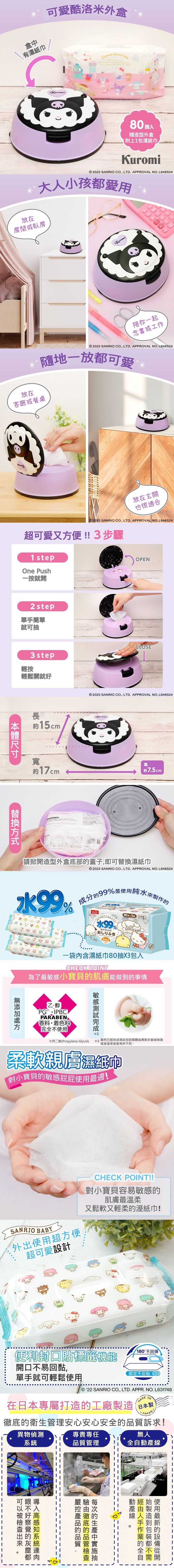 本組合內含:三麗鷗造型濕紙巾盒一款(盒內含一包純水99.9%濕紙巾80抽1包)