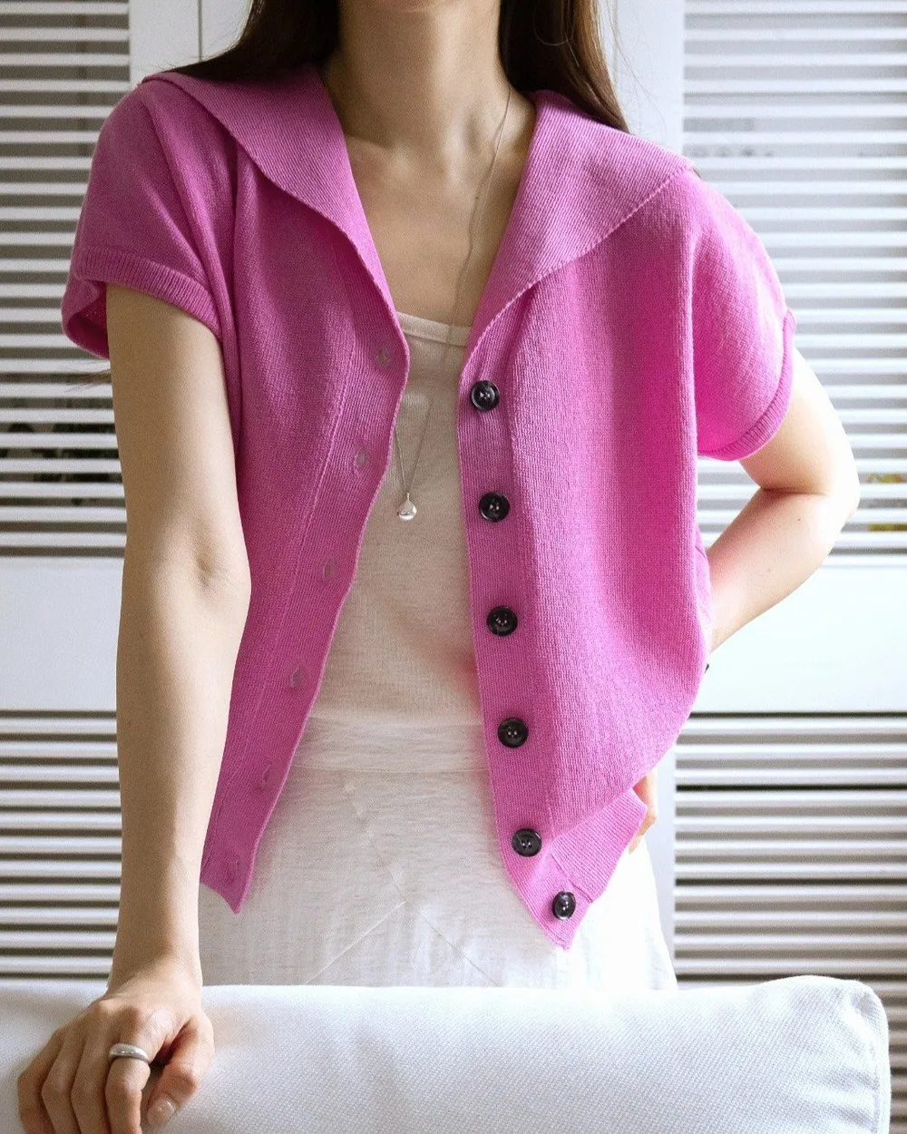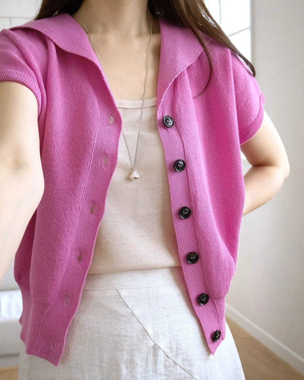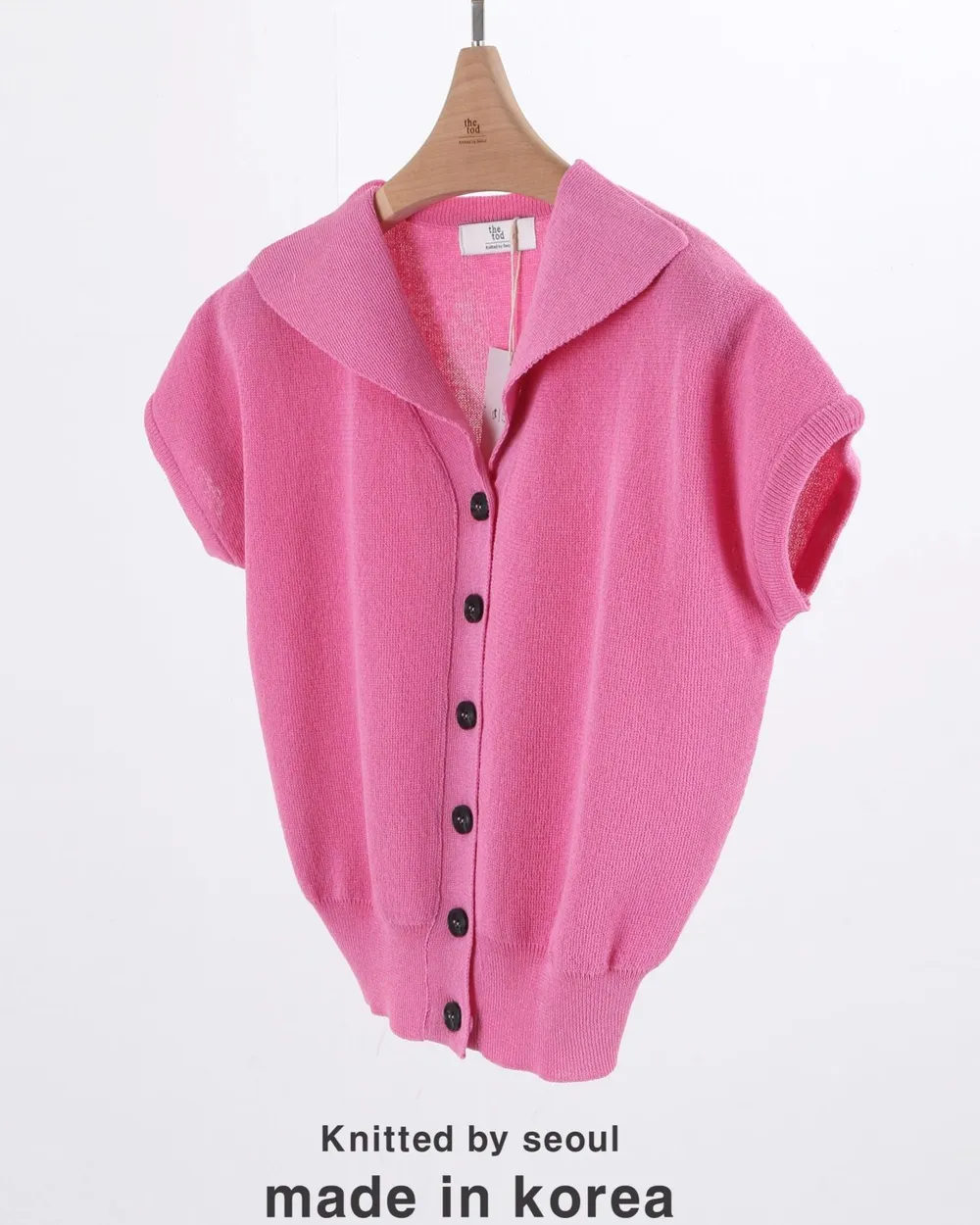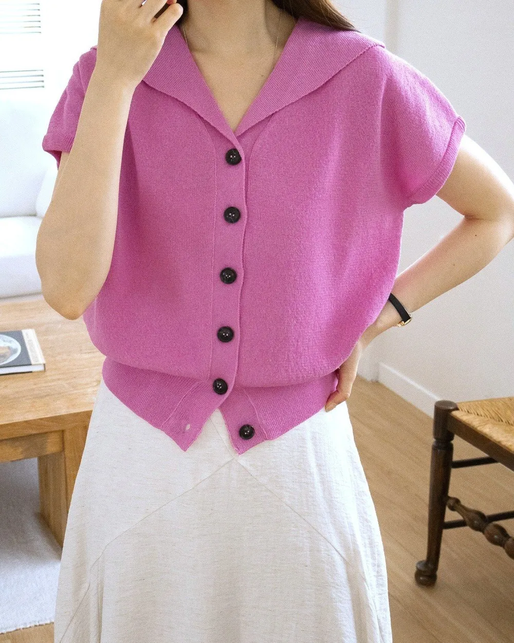 • 品名:韓製 清爽棉麻排釦落肩短袖針織外套/上衣