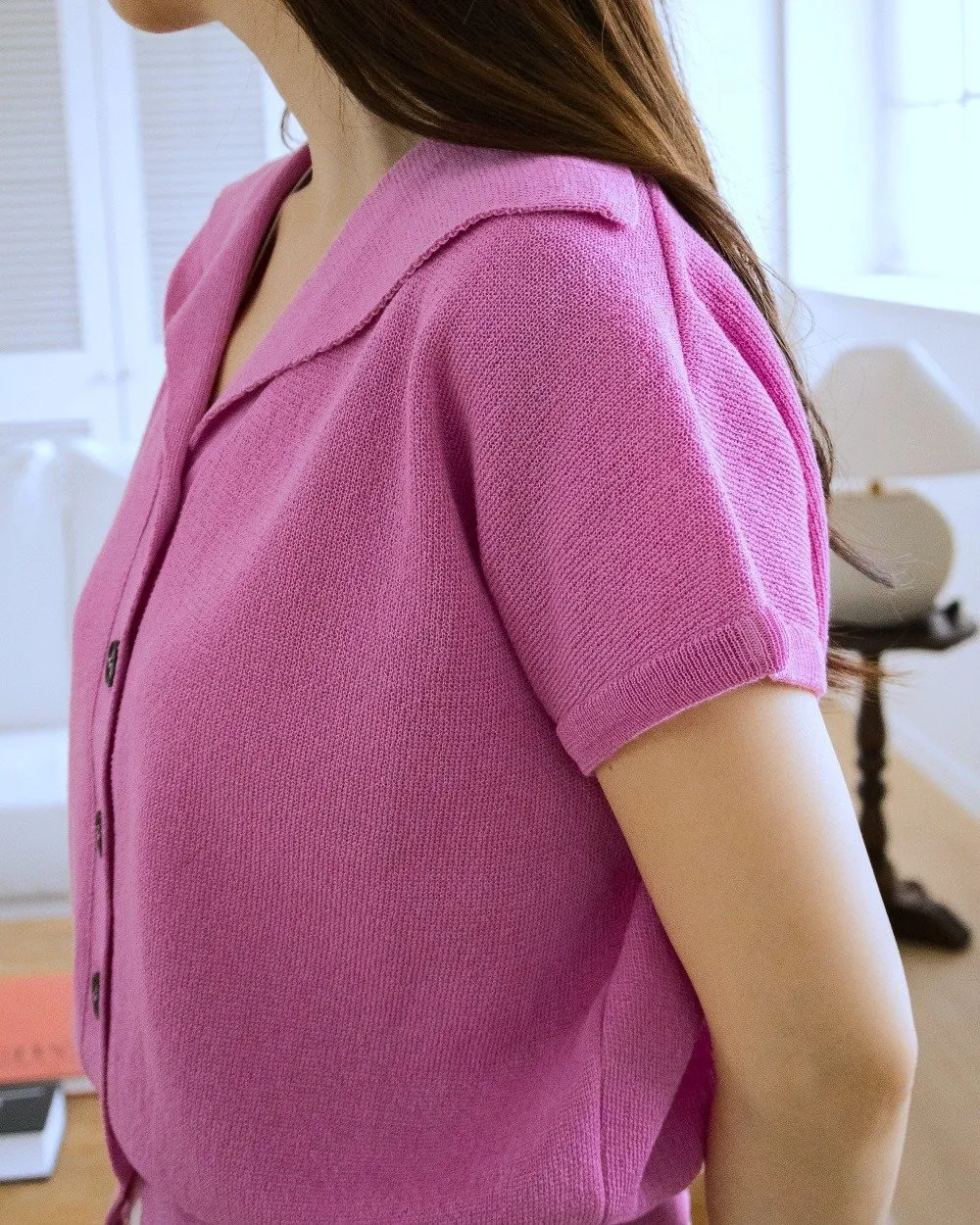 韓國女裝連線 - 韓製 清爽棉麻排釦落肩短袖針織外套/上衣-桃紫 (FREE)