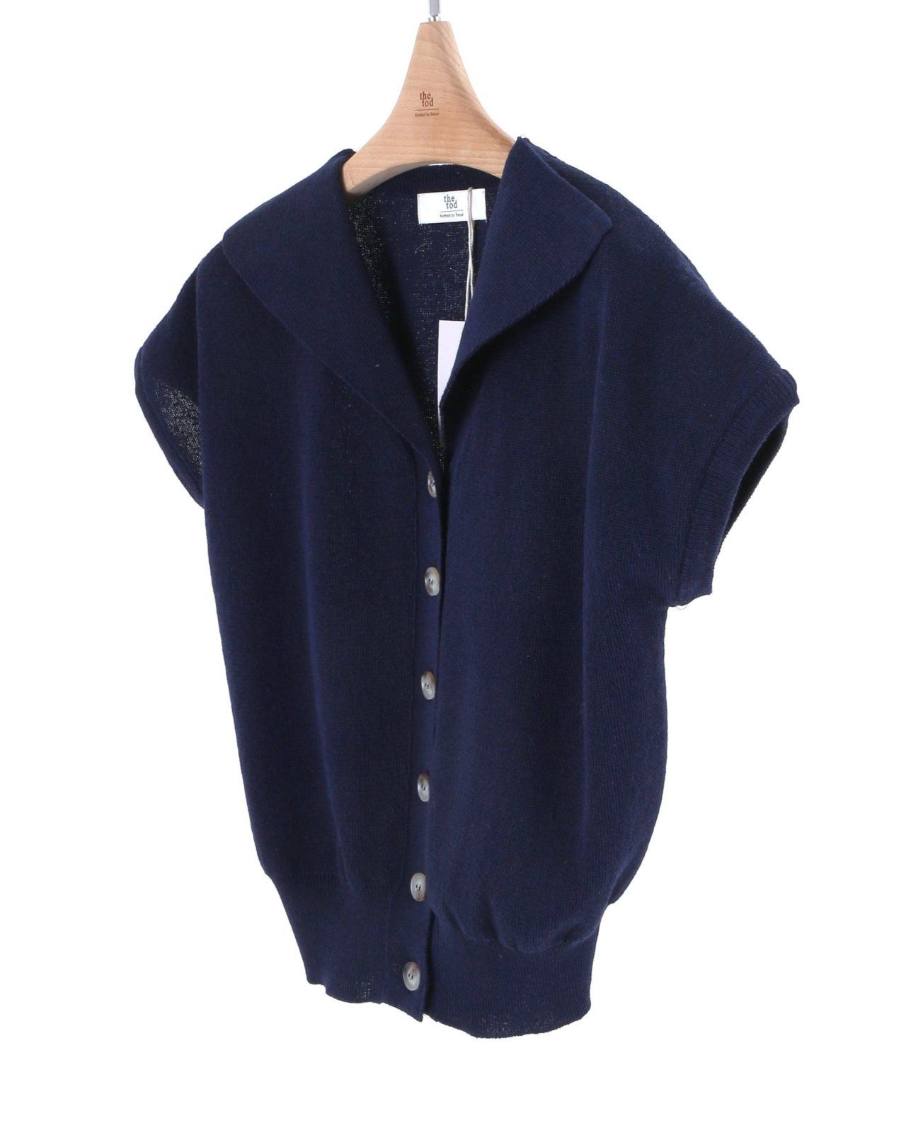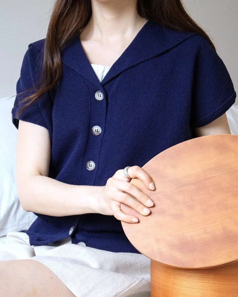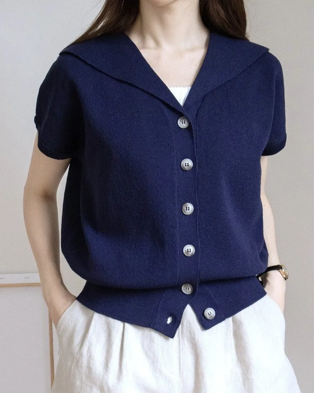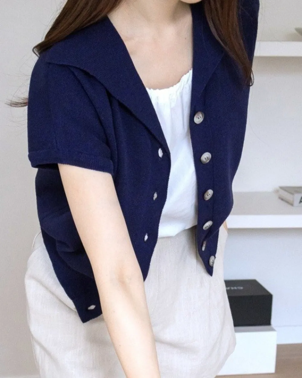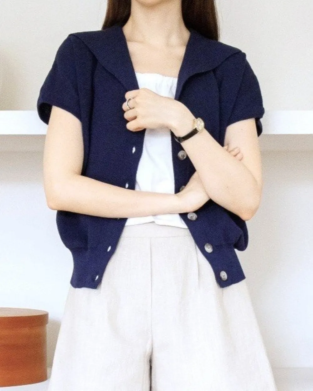 韓國女裝連線 - 韓製 清爽棉麻排釦落肩短袖針織外套/上衣-海軍藍 (FREE)