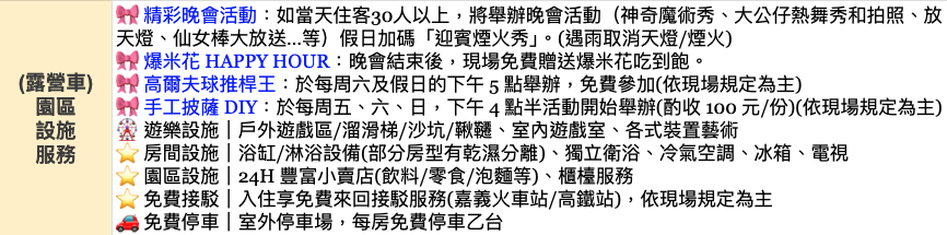 這次帶著家人來到【嘉義詩情花園渡假村】,詩情花園渡假村主打露營車住宿的懶人露營,露營車擁有獨立的休息及衛浴空間,輕鬆愜意親近大自然的同時擁有飯店舒適的享受,還有豐富的活動及設施,兒童遊戲室、沙坑,腳踏車免費租借,披薩DIY、親子高爾夫球,假日晚間還有煙火秀放天燈及爆米花...等等,超適合親子同遊!
