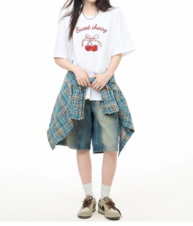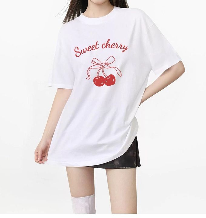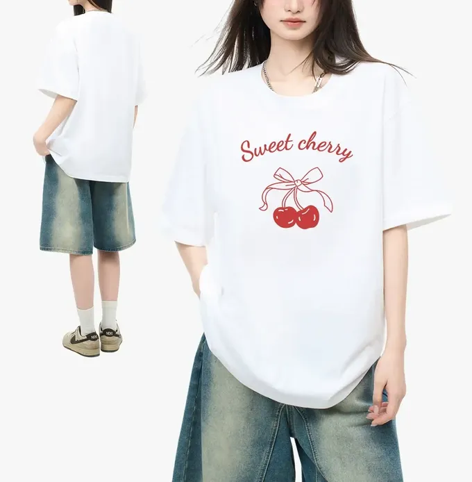 純棉寬版印花T恤-紅色櫻桃-紫色