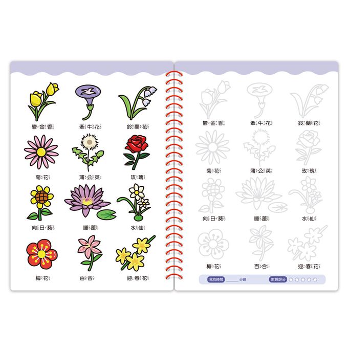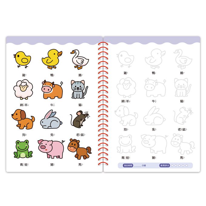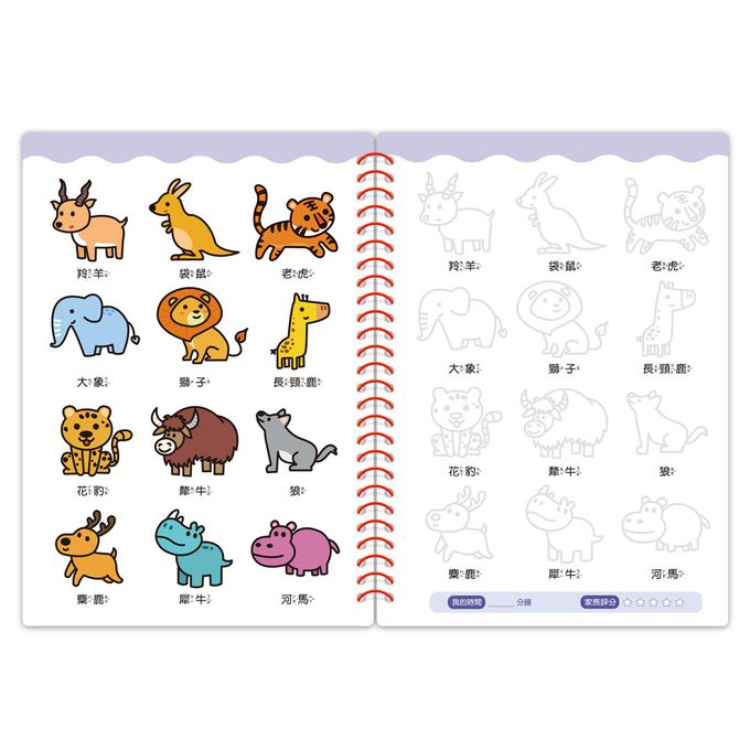 大字形附注音的動物、昆蟲、植物內容,幫孩子打下基礎認知,同時配合凹槽畫圖、寫字,家長也可以依照孩子的程度幫忙評分,促進親子間互動關係,共享親子互動時光。書末還有連連看等小遊戲,讓孩子學會以後練習,強化認知記憶。
