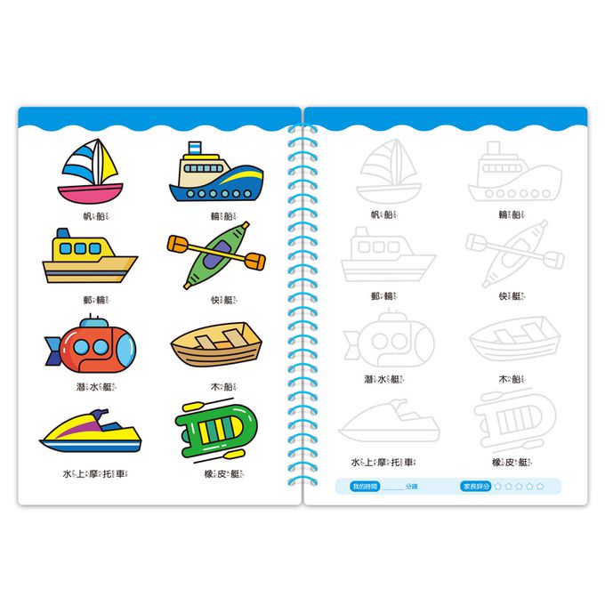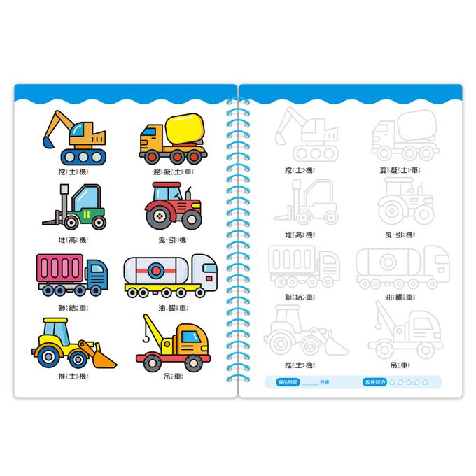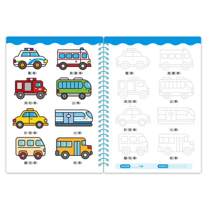 大字形附注音的交通工具內容,讓孩子認知交通工具,同時配合凹槽畫圖、寫字,家長也可以依照孩子的程度幫忙評分,促進親子間互動關係,共享親子互動時光。書末還有連連看等小遊戲,讓孩子學會以後練習,強化認知記憶。