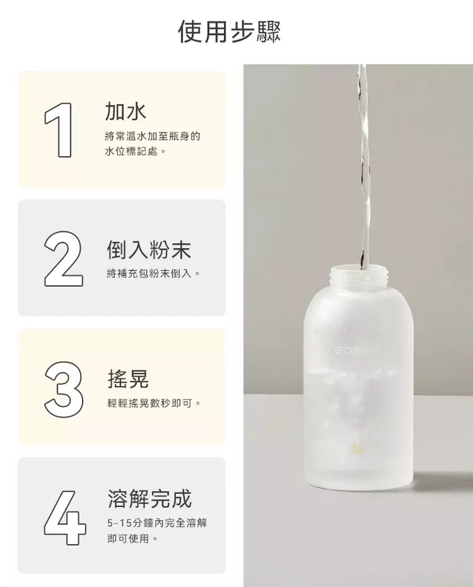 專利配方可於常溫水快速溶解,適用過濾水與自來水,便利安心,更貼近日常生活。