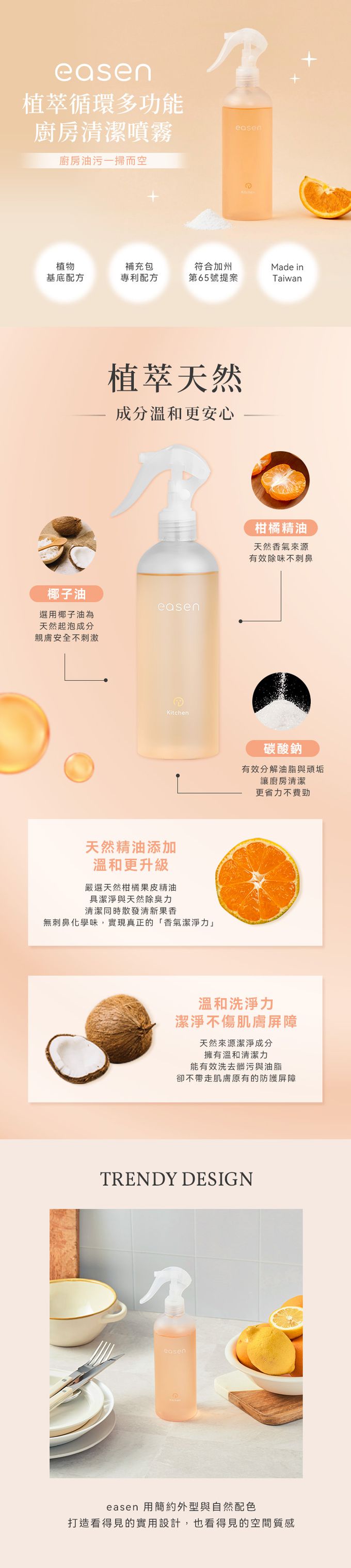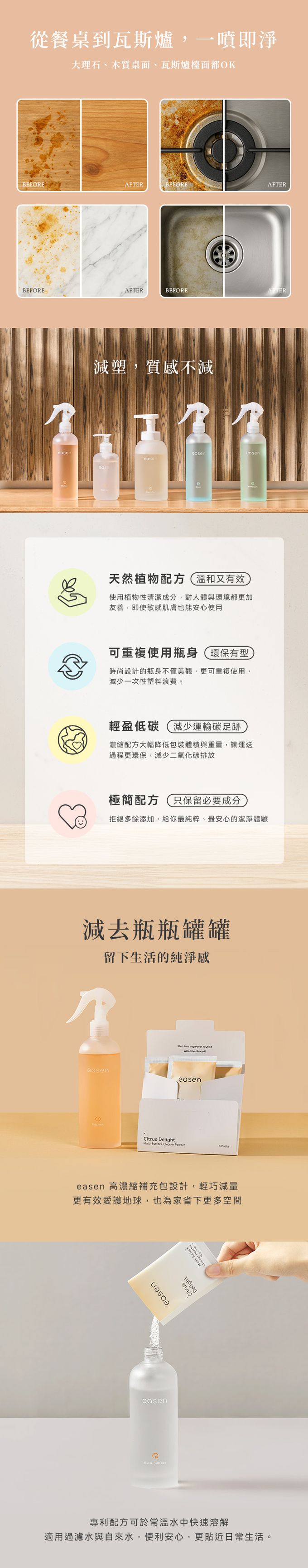Easen 植萃循環多功能廚房清潔噴霧,以柑橘果皮精油調香,輕輕一噴、隨手一拭,