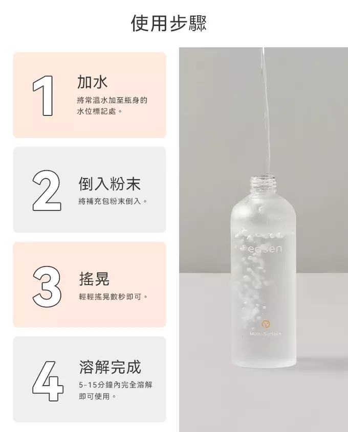 專利配方可於常溫水快速溶解,適用過濾水與自來水,便利安心,更貼近日常生活。