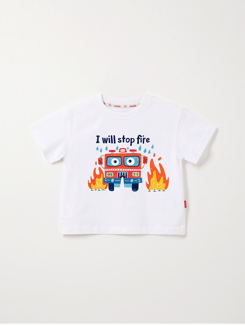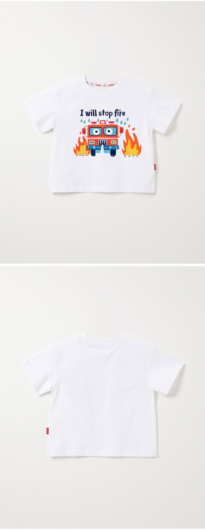 韓國 OZKIZ - 100%澳洲棉純粹呼吸短袖上衣-勇敢消防車-白