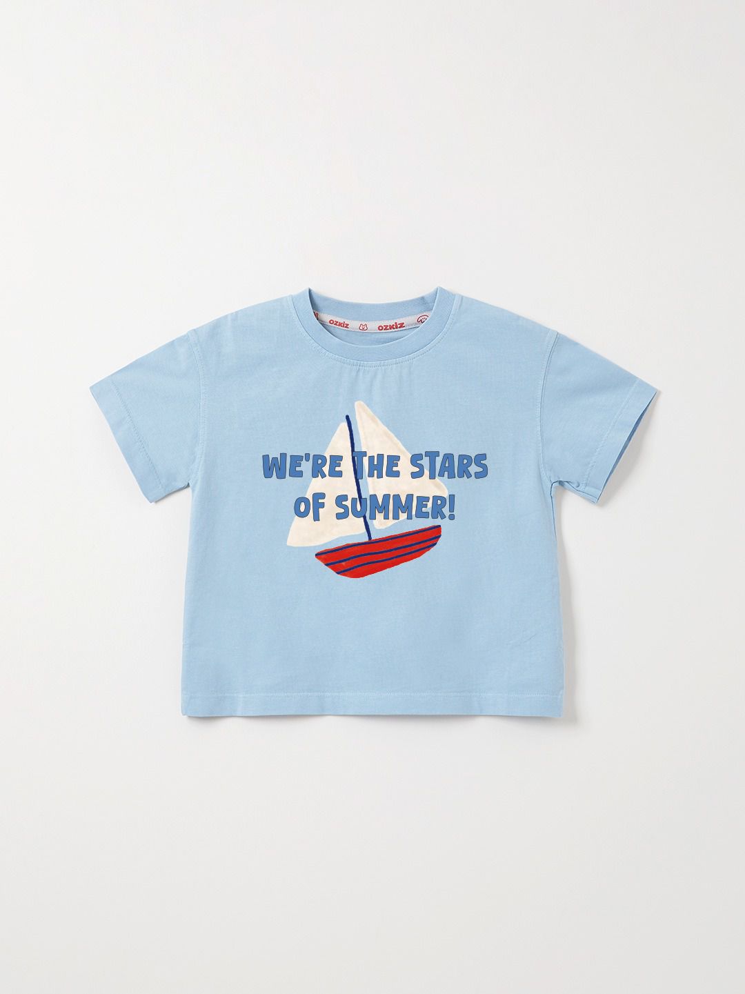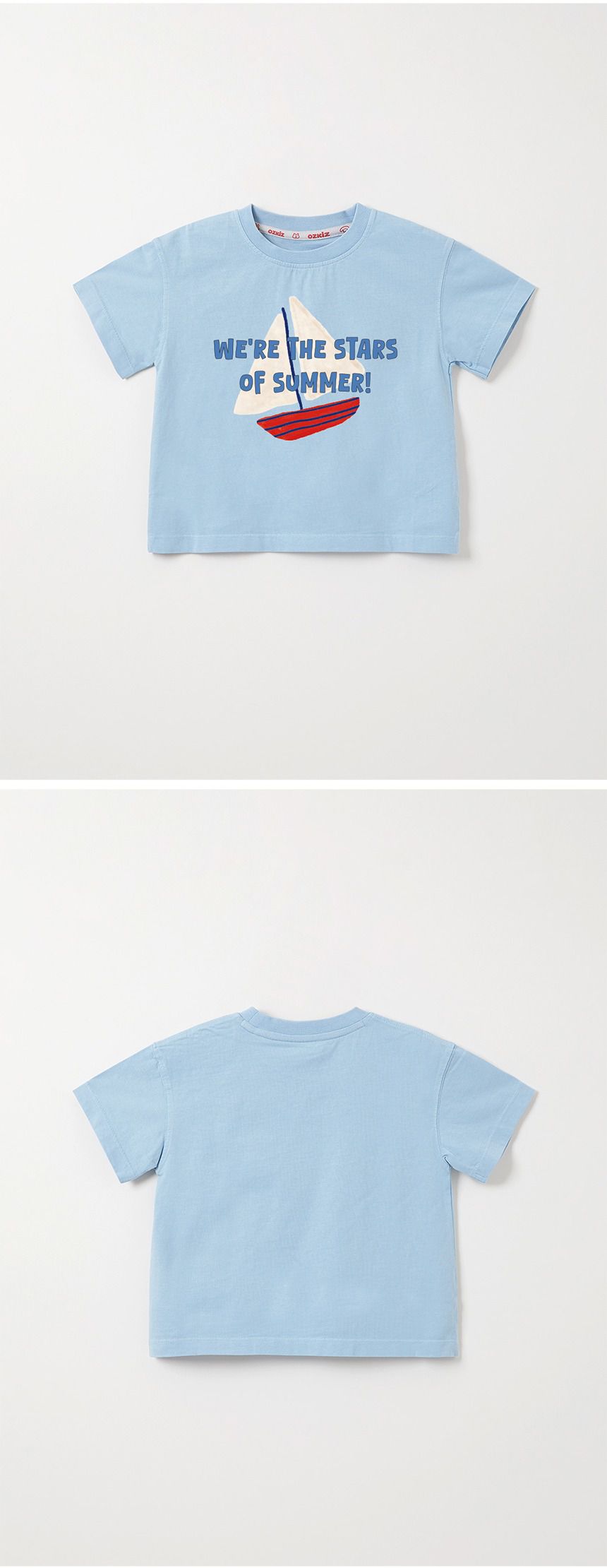 韓國 OZKIZ - 100%澳洲棉純粹呼吸短袖上衣-塗鴉帆船-天藍