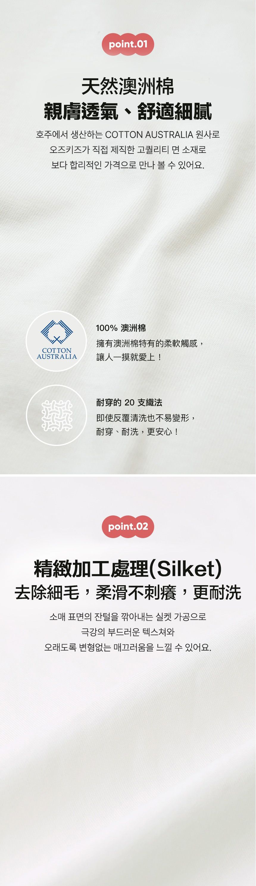 • 100%天然澳洲棉,細膩透氣、舒適親膚