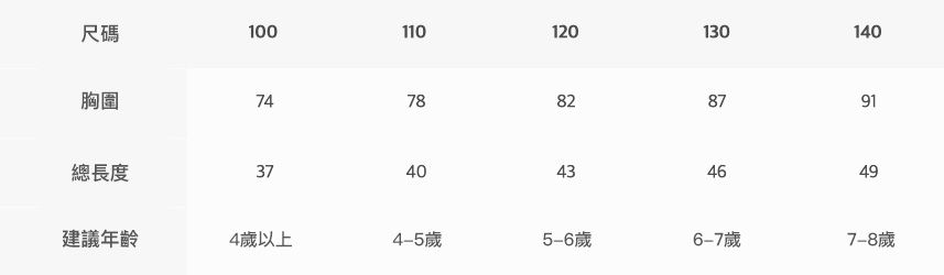 2. 平均尺寸表乃參考平均值制定,每位孩童成長速度略有不同,請參考孩子實際體型、現有衣物尺寸等實際測量結果進行選購。