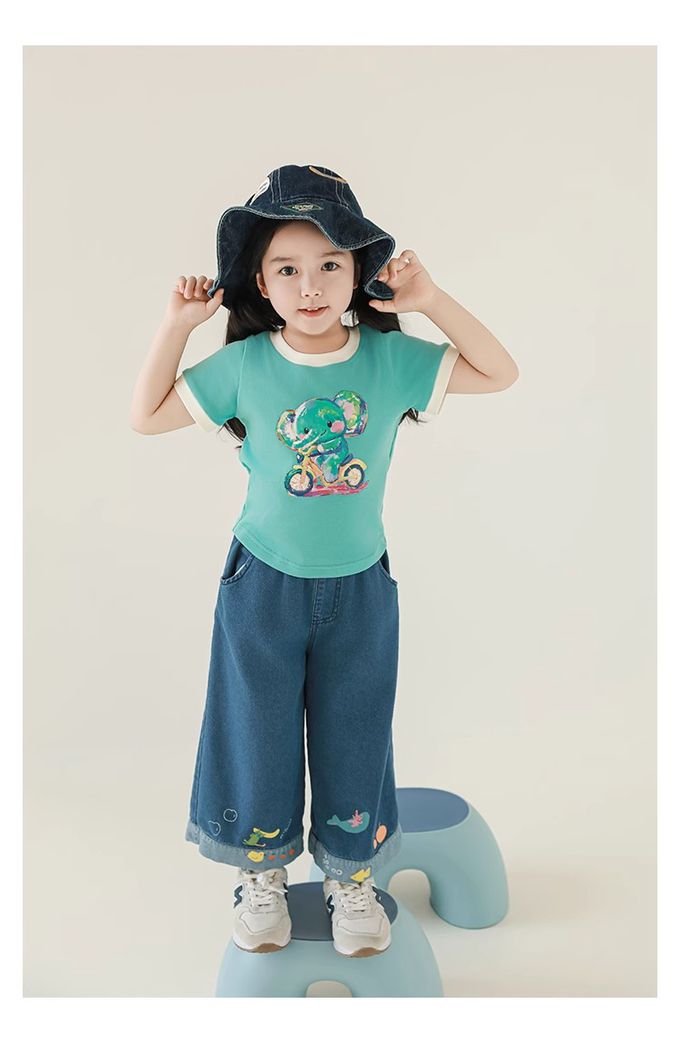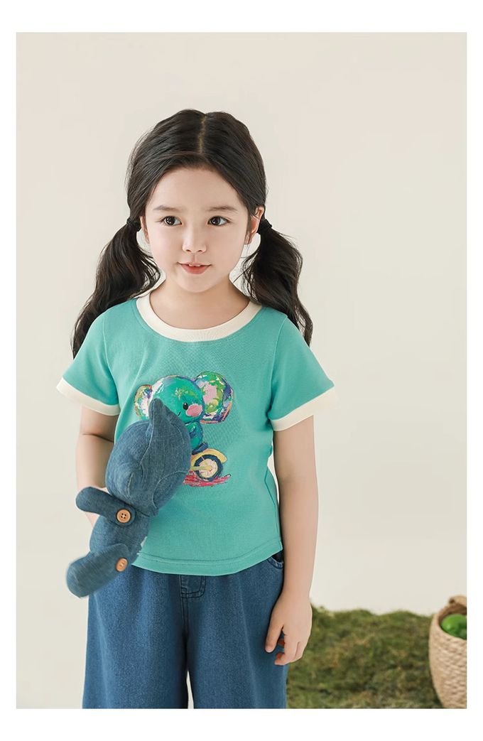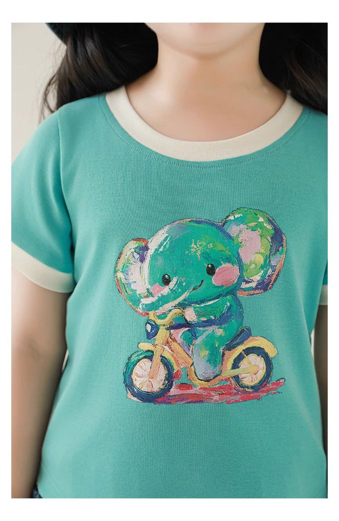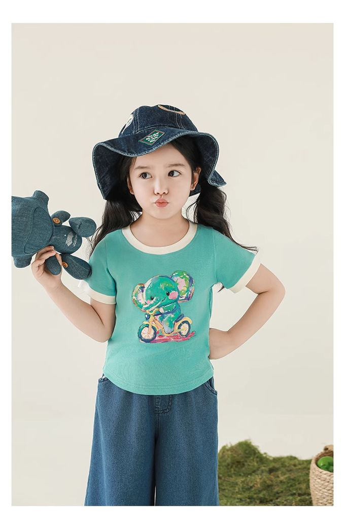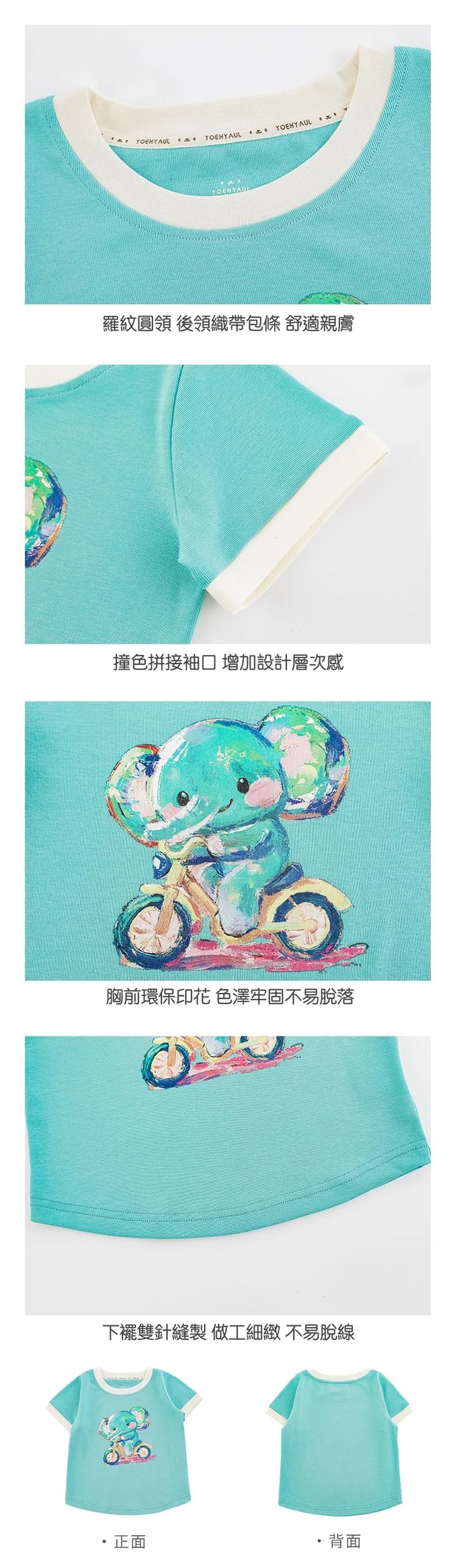 撞色拼接圓領短袖上衣-大象-藍綠色