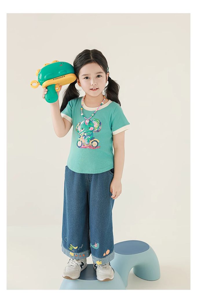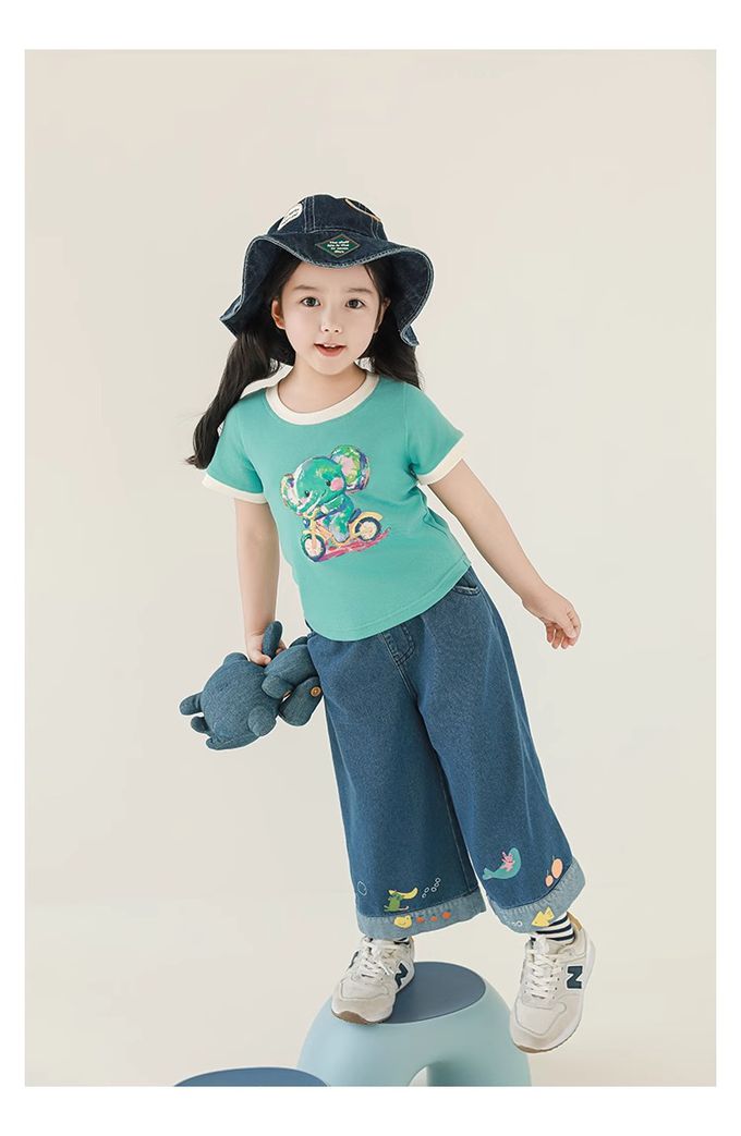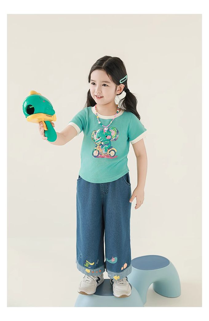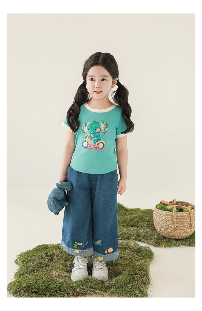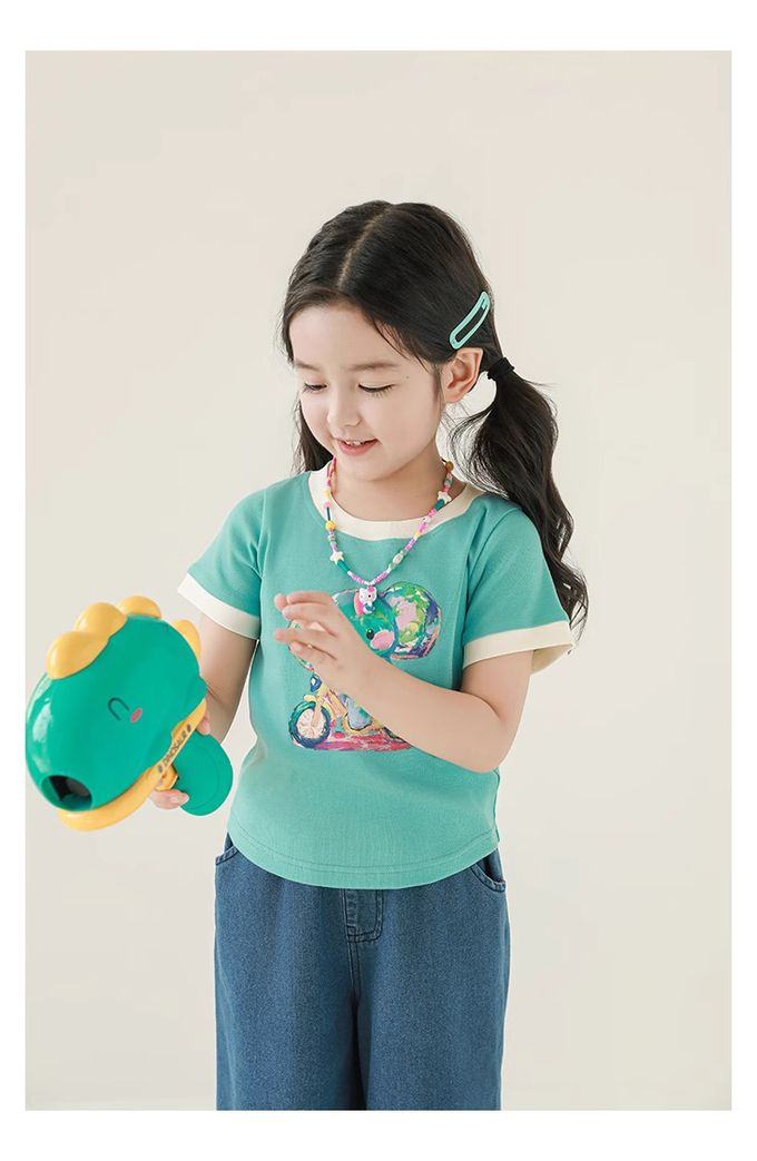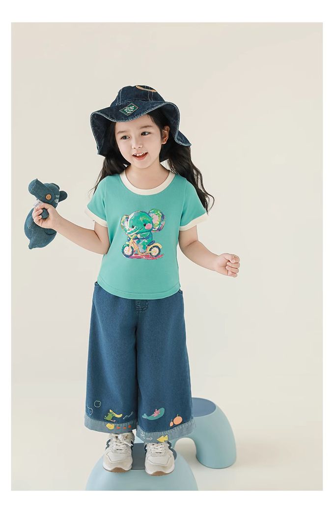 撞色拼接圓領短袖上衣-大象-藍綠色