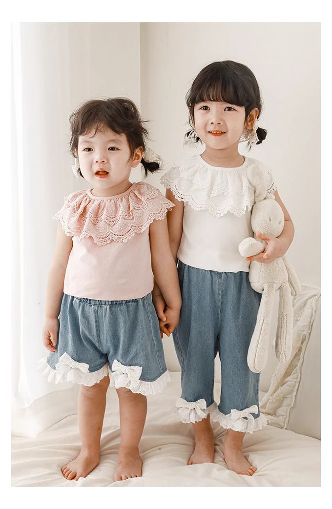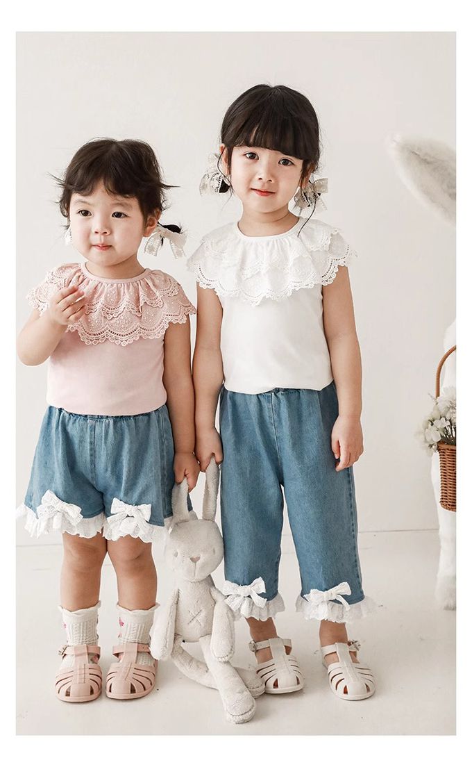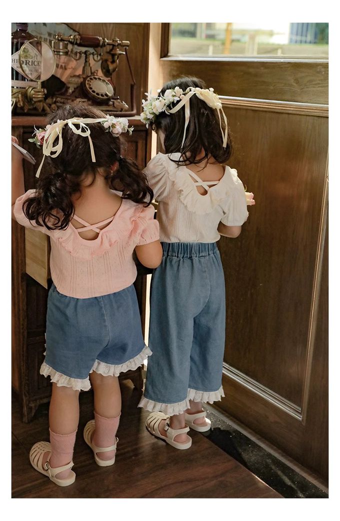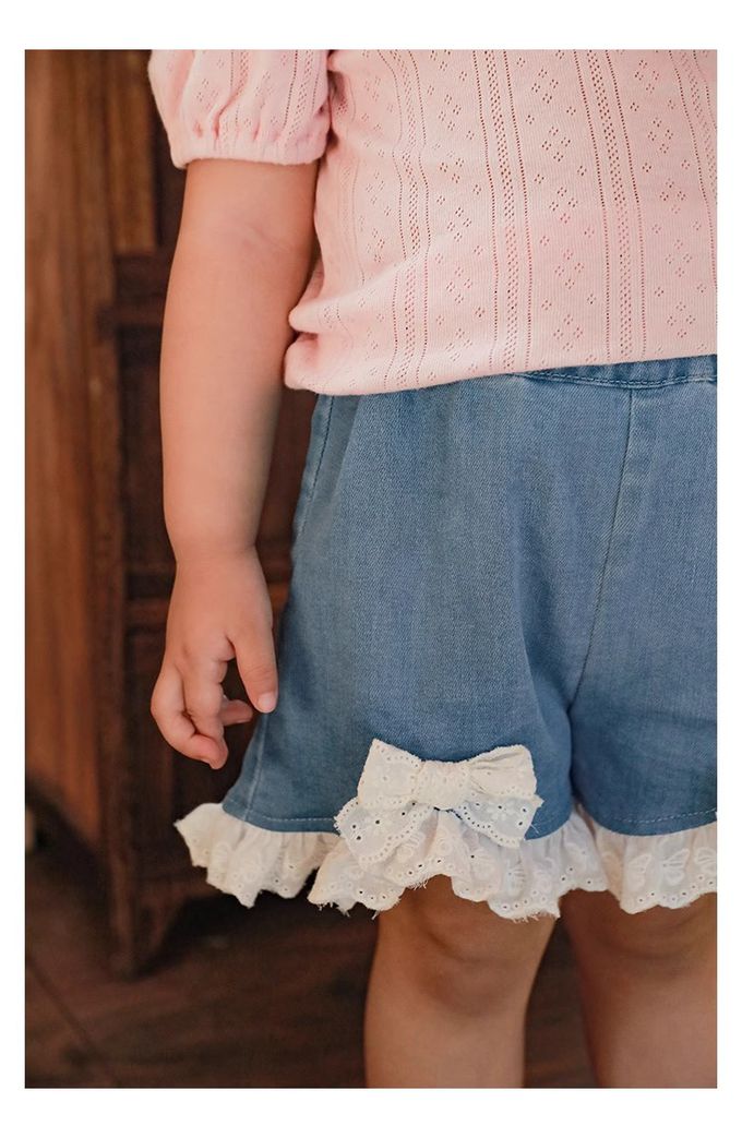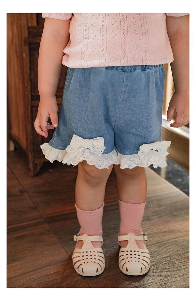 純棉蕾絲花邊牛仔短褲-蝴蝶結-藍色
