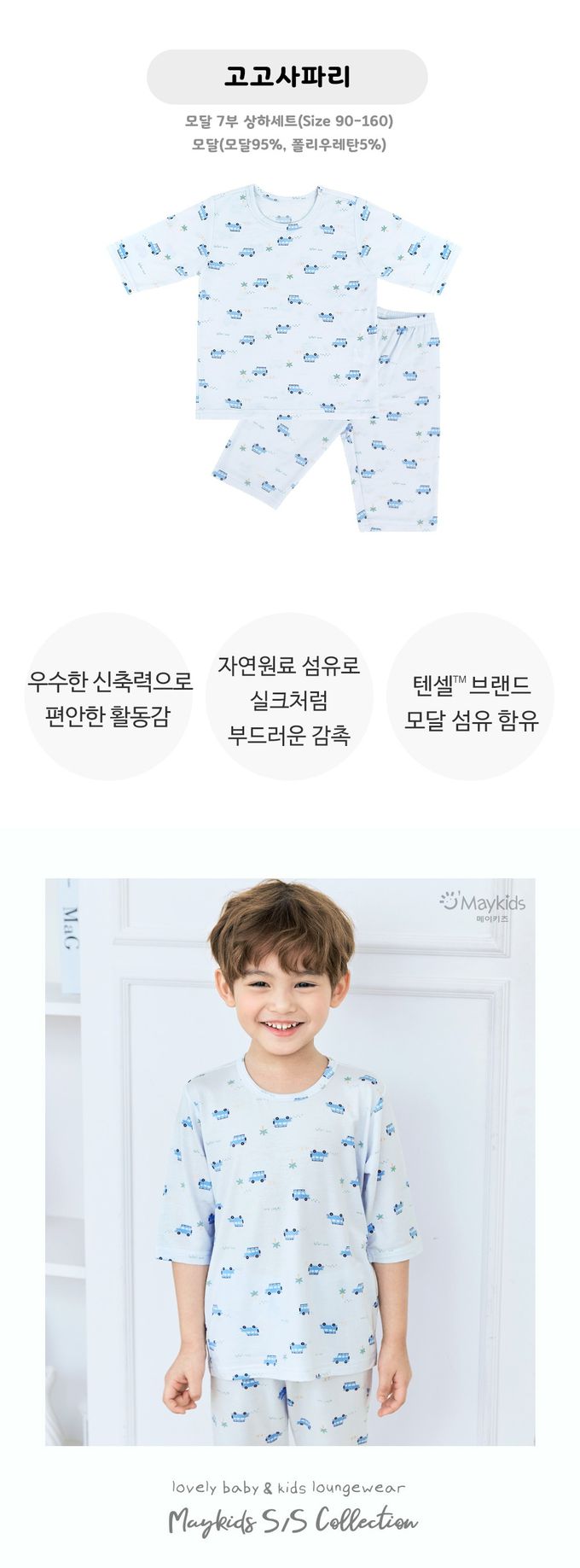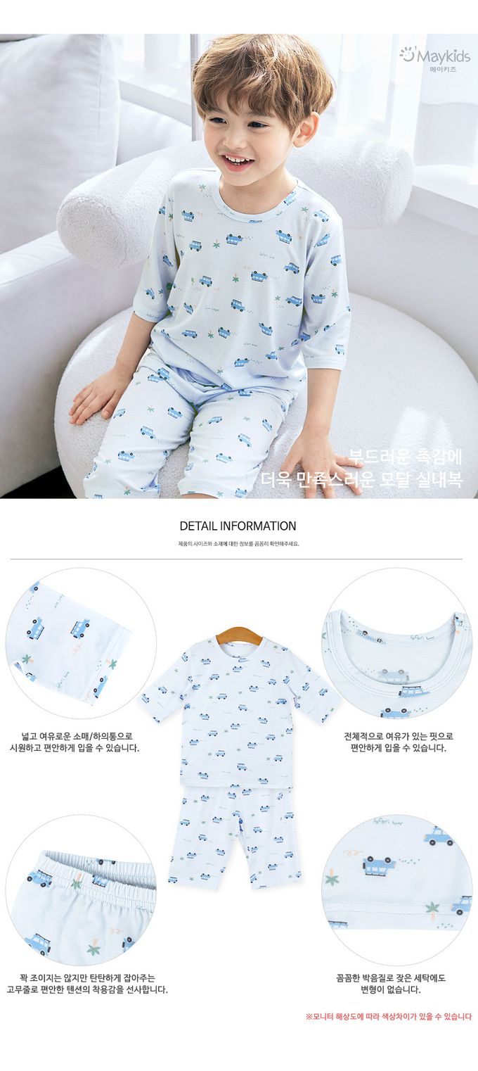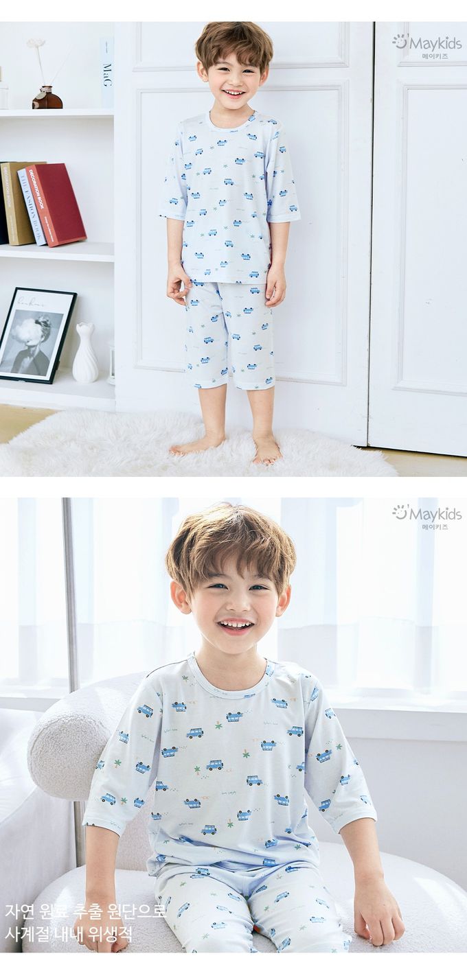 韓國 Maykids - 天絲莫代爾透氣七分袖家居服-車車-淺藍