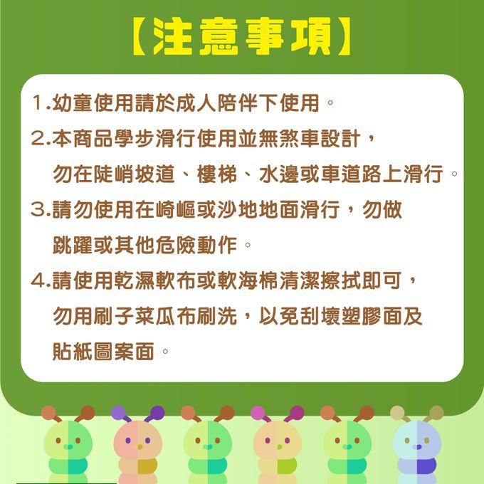 2.本商品學步滑行使用並無煞車設計,勿在陡峭坡道、樓梯、水邊或車道路上滑行。
