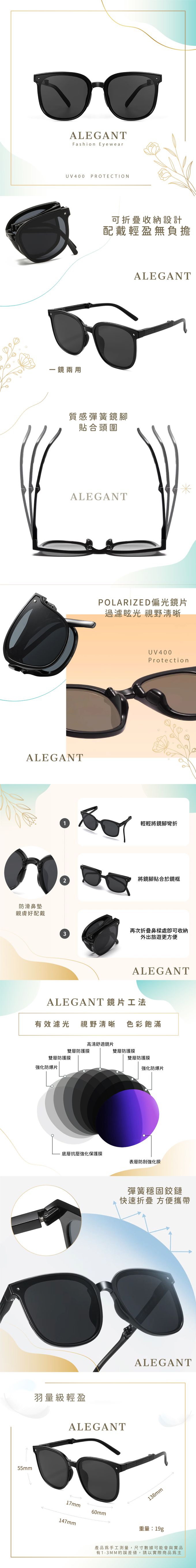 ALEGANT產品特色:時尚、舒適、輕盈、防護!抗UV400折疊太陽眼鏡超輕量氣墊感鼻墊,配戴輕盈無負擔抗UV400有效阻隔紫外線傷害,炎炎夏日不僅防曬、時尚又吸睛採用POLARIZED寶麗來偏光鏡片,讓強烈眩光變柔和、視野清晰韓版復古光滑質感平面方型鏡框,小銀飾片點綴整體框型質感鏡框鑲嵌光滑鏡面,讓追求變化與細節的人有了心動的選擇一體成型式立體鼻墊,低鼻樑也適合配戴,適合各種臉型搭配多層鍍膜鏡片,擁有較高的阻隔率與透光度,抵擋紫外線,品質有保障