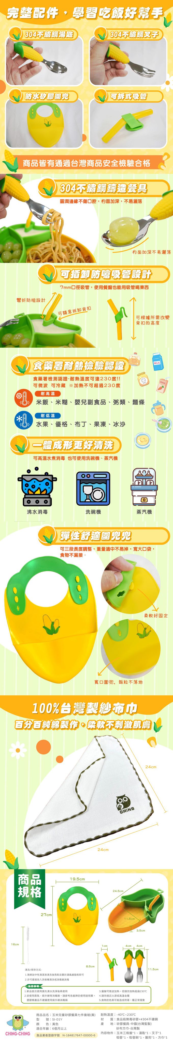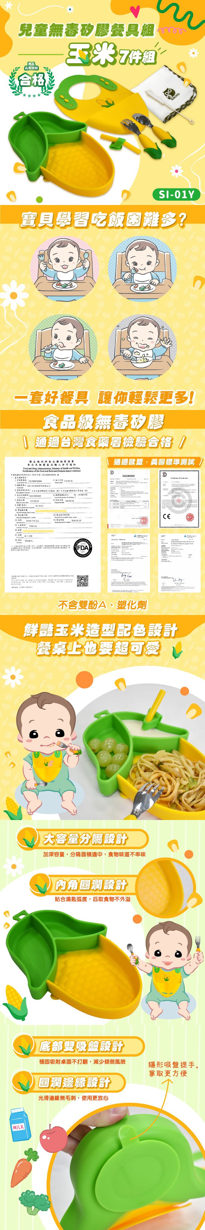 品 名:黃色玉米 兒童無毒矽膠餐具+台製方巾 7件組