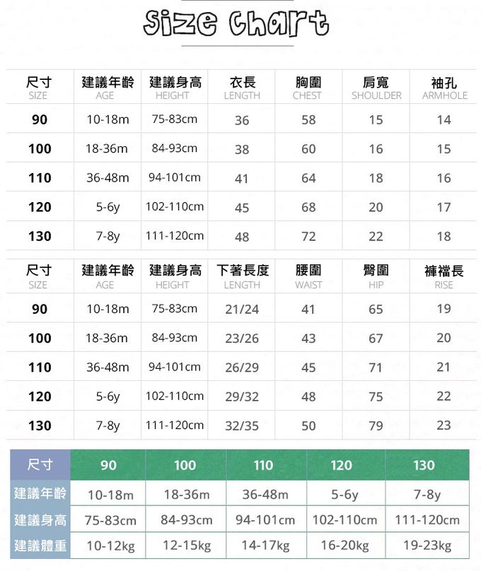 1. 尺寸表單位皆為公分(cm),實際尺寸會因布料彈性、水洗、測量起迄點等因素略有誤差。購買前,建議參考寶貝現有的衣物尺寸做對照。