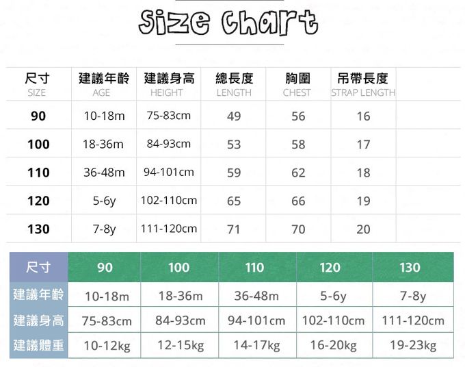 1. 尺寸表單位皆為公分(cm),實際尺寸會因布料彈性、水洗、測量起迄點等因素略有誤差。購買前,建議參考寶貝現有的衣物尺寸做對照。