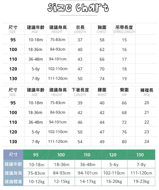 1. 尺寸表單位皆為公分(cm),實際尺寸會因布料彈性、水洗、測量起迄點等因素略有誤差。購買前,建議參考寶貝現有的衣物尺寸做對照。