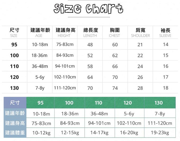 1. 尺寸表單位皆為公分(cm),實際尺寸會因布料彈性、水洗、測量起迄點等因素略有誤差。購買前,建議參考寶貝現有的衣物尺寸做對照。