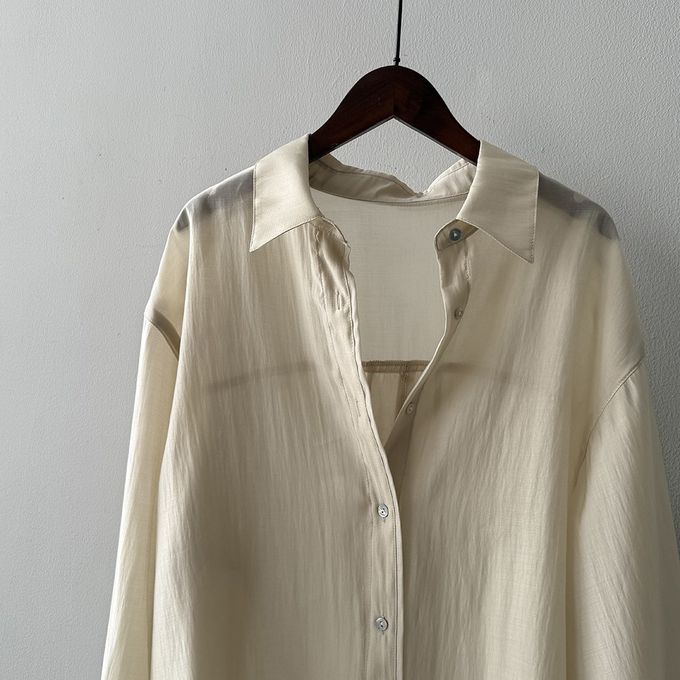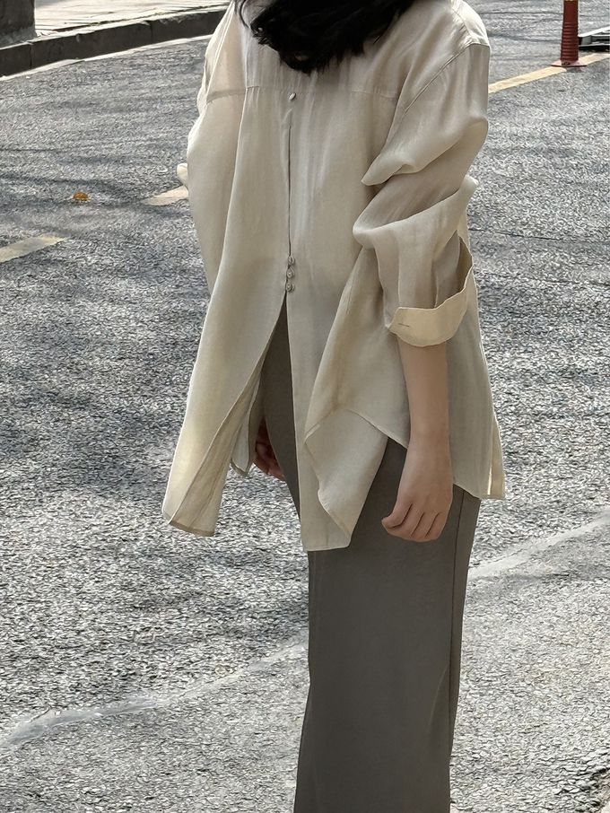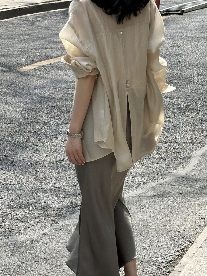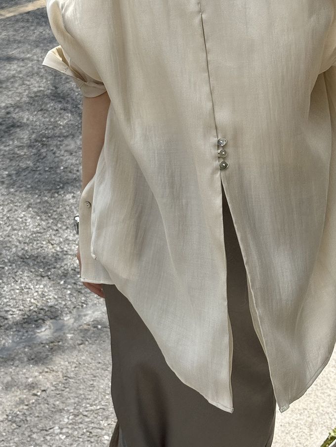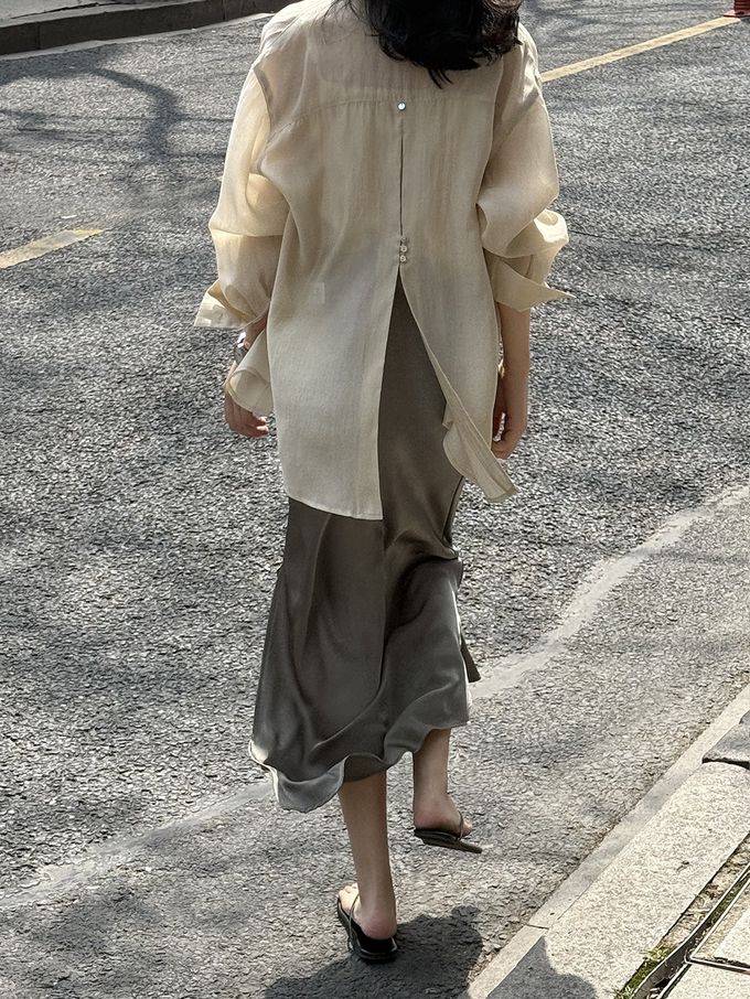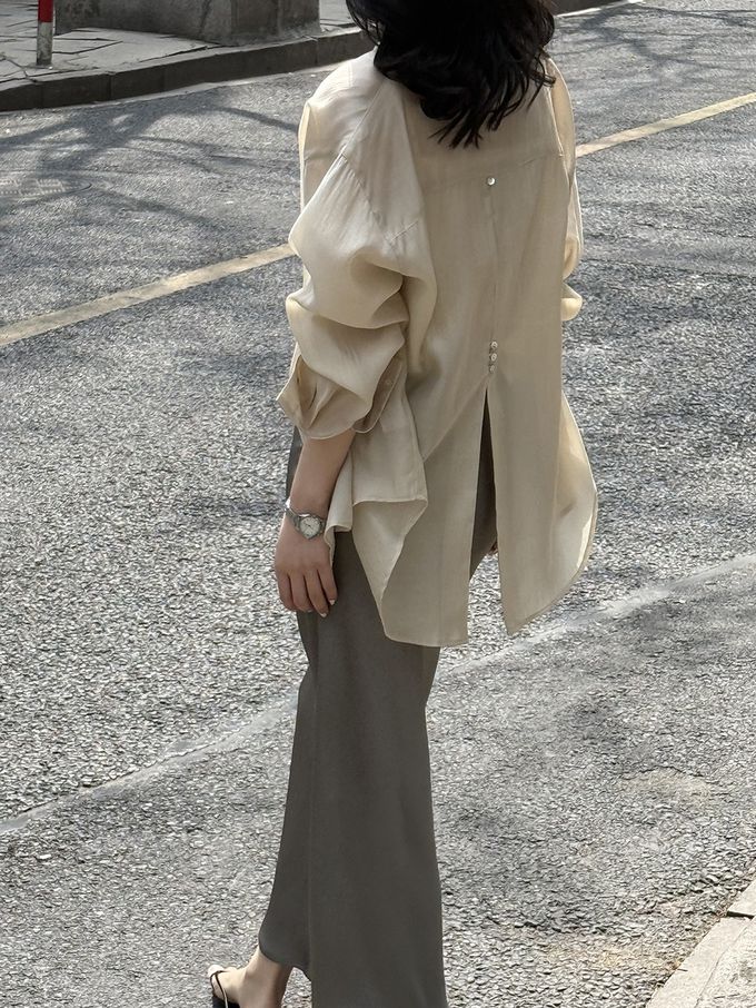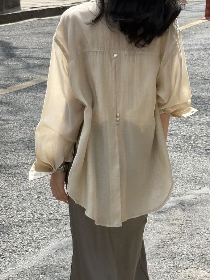 透膚感薄長袖襯衫-後開衩貝殼釦-香檳杏