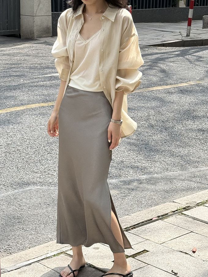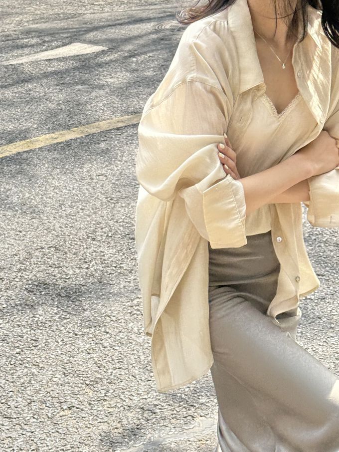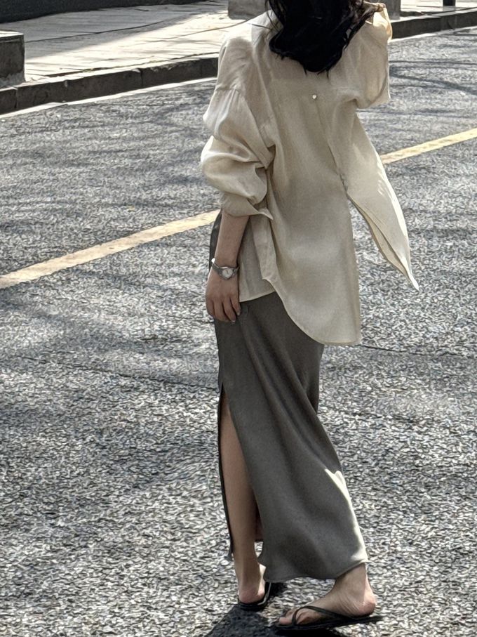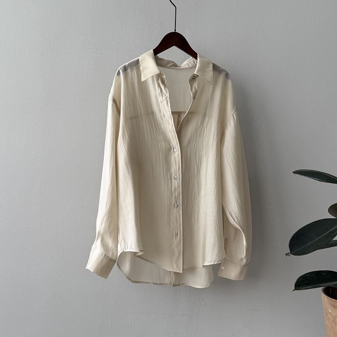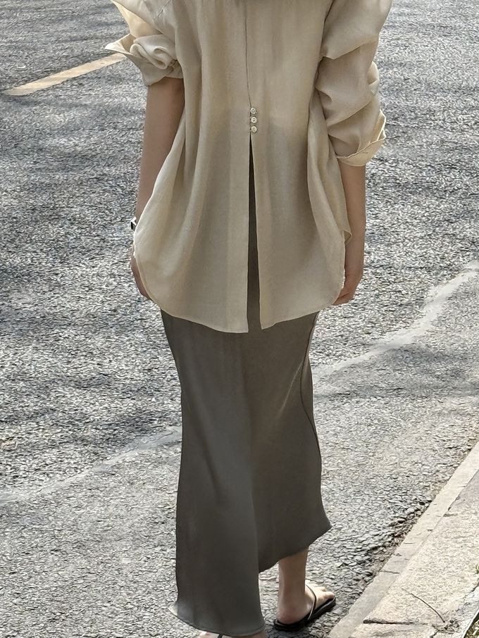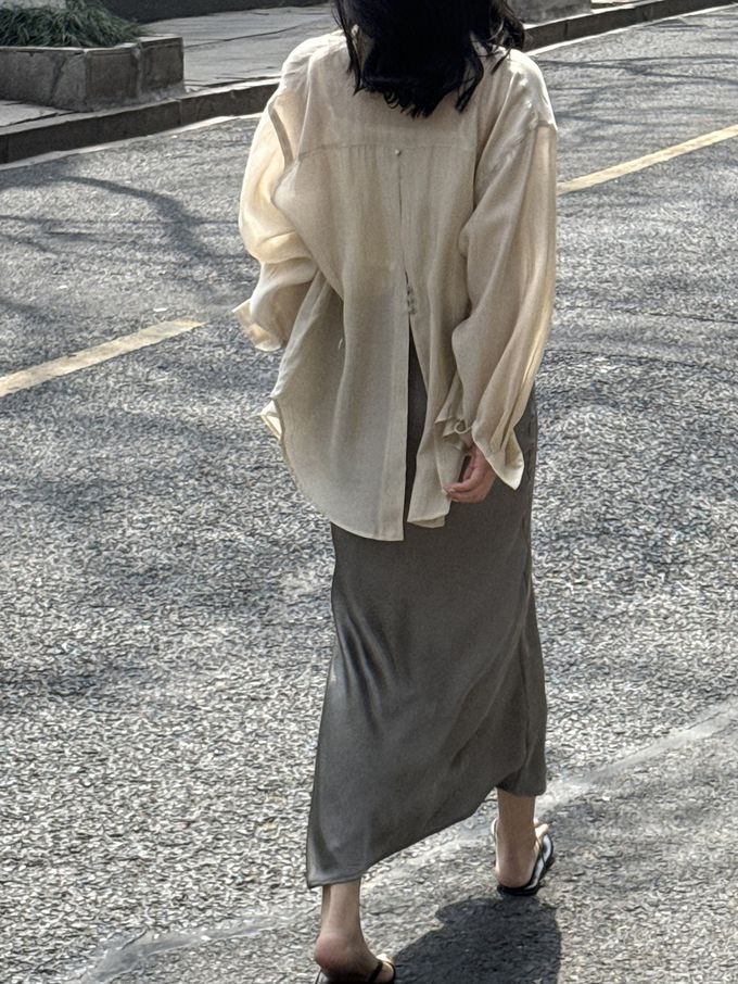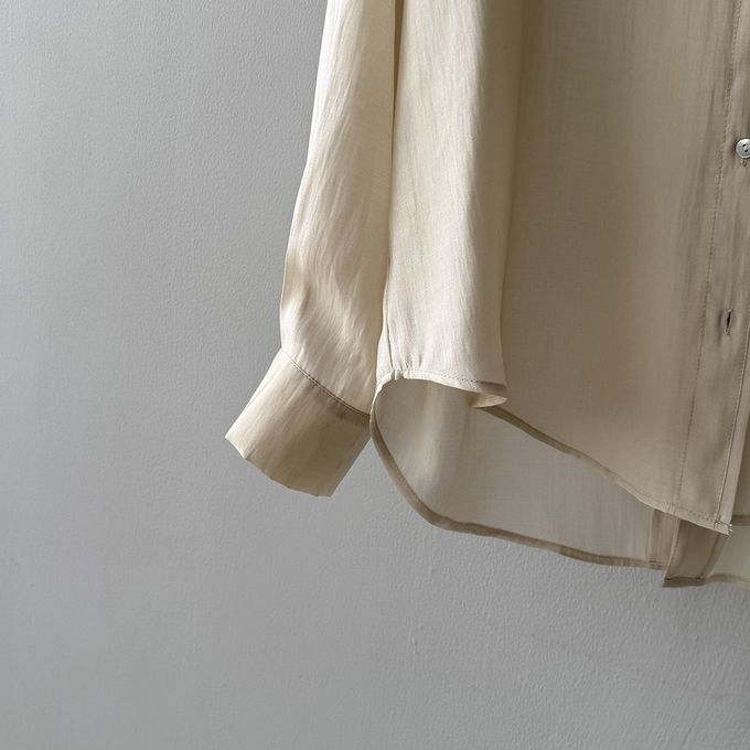透膚感薄長袖襯衫-後開衩貝殼釦-香檳杏