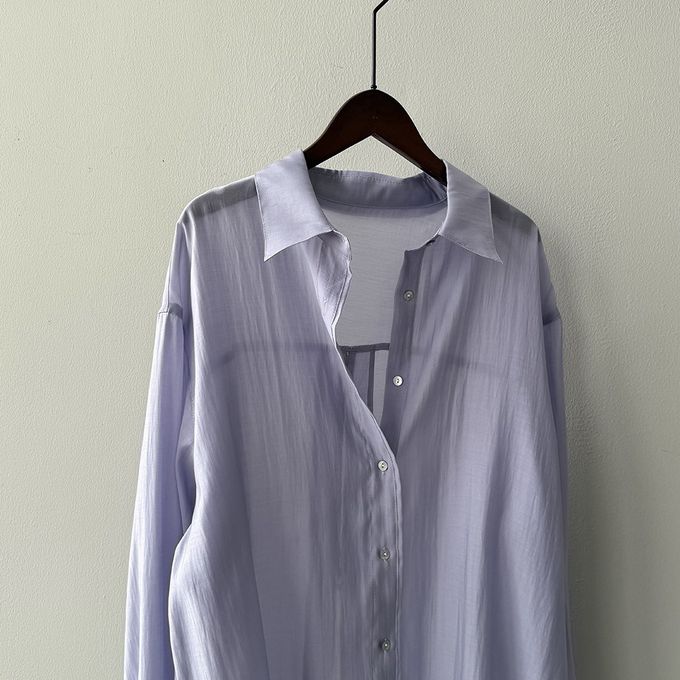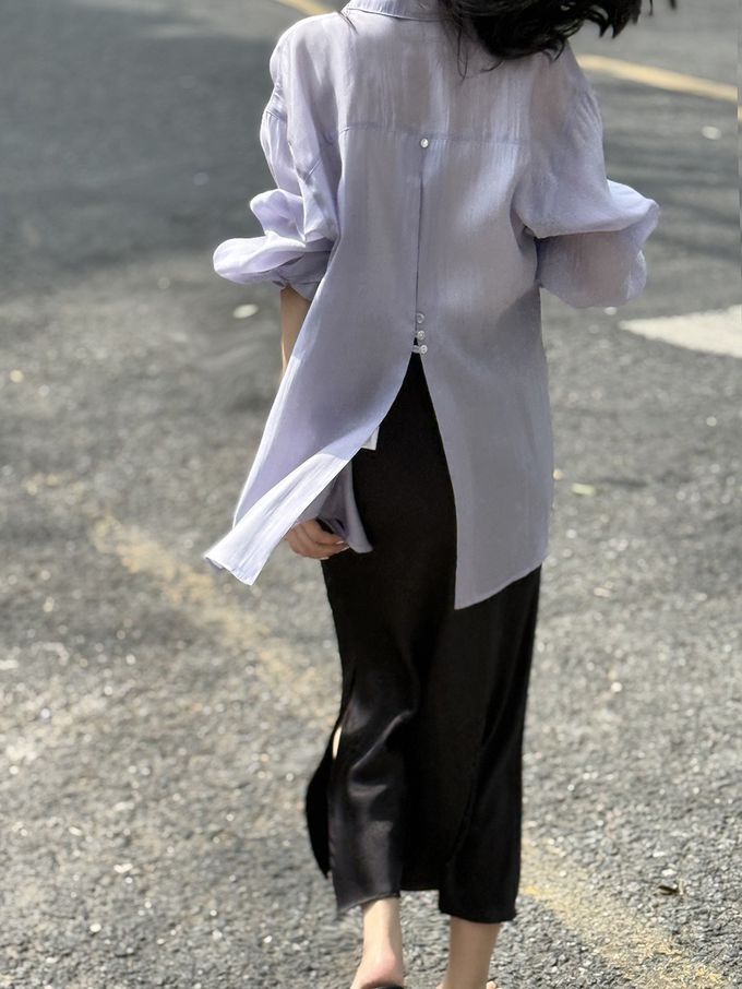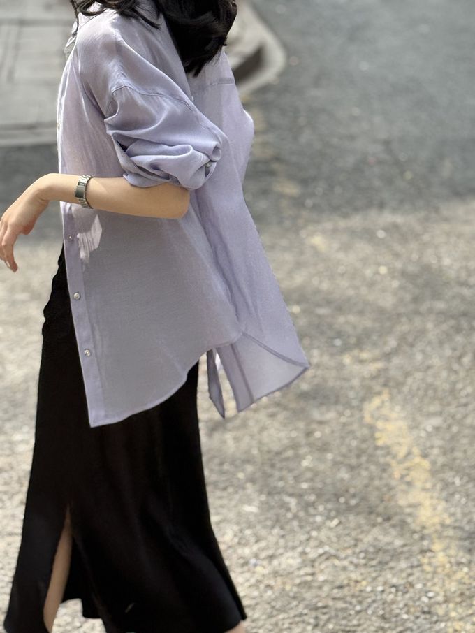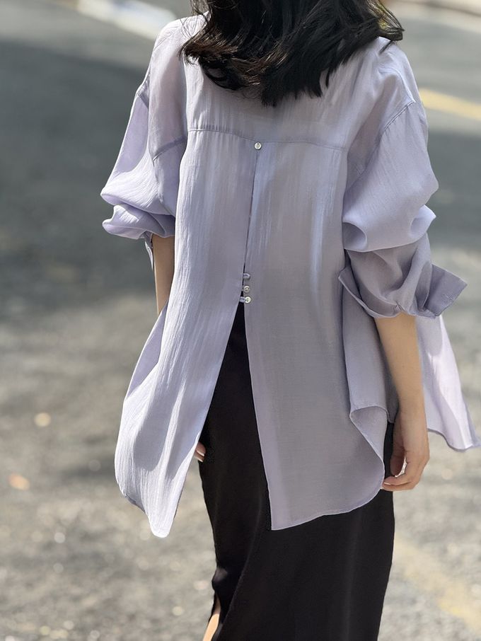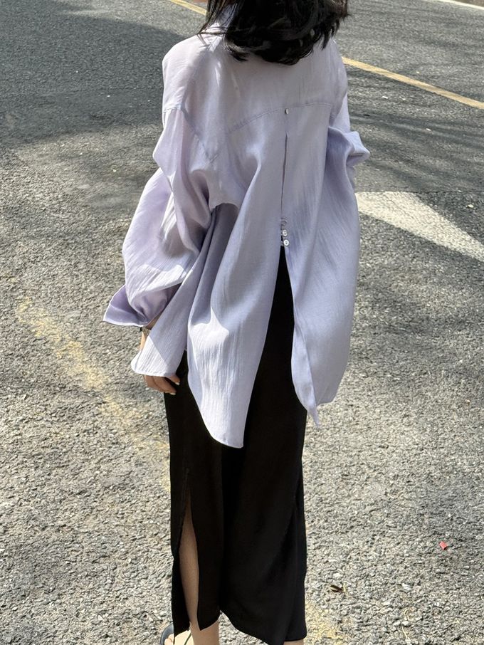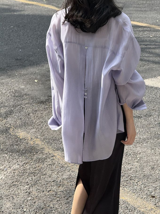 透膚感薄長袖襯衫-後開衩貝殼釦-霧紫色