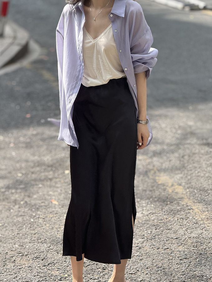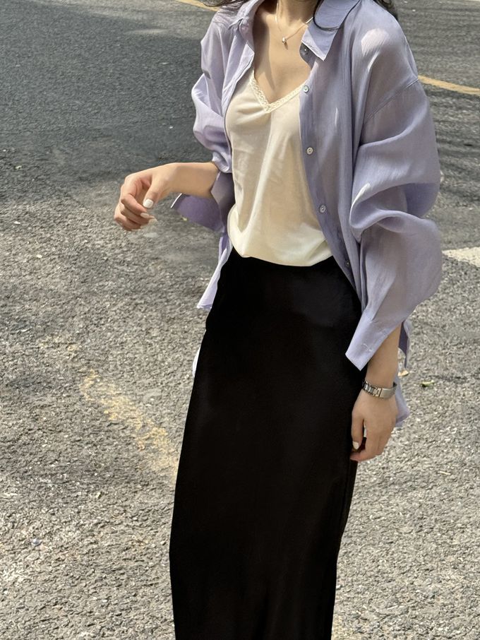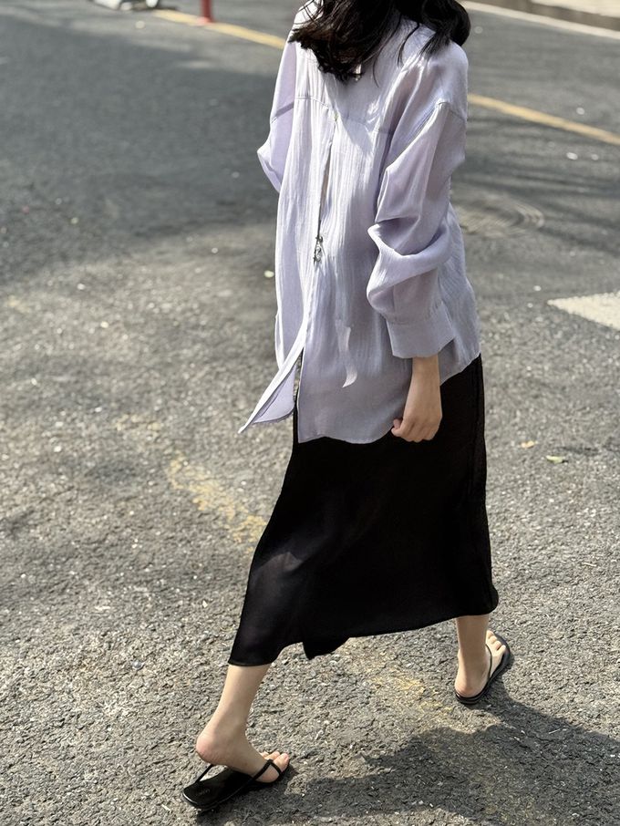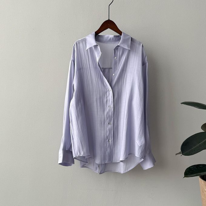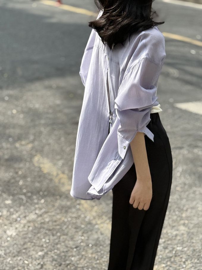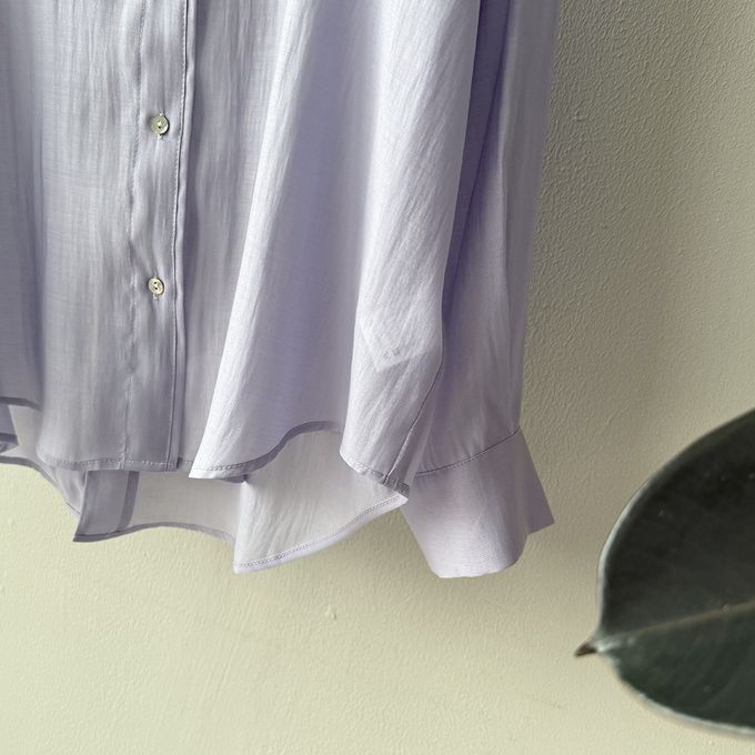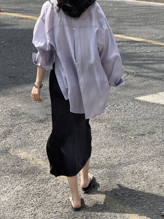 透膚感薄長袖襯衫-後開衩貝殼釦-霧紫色