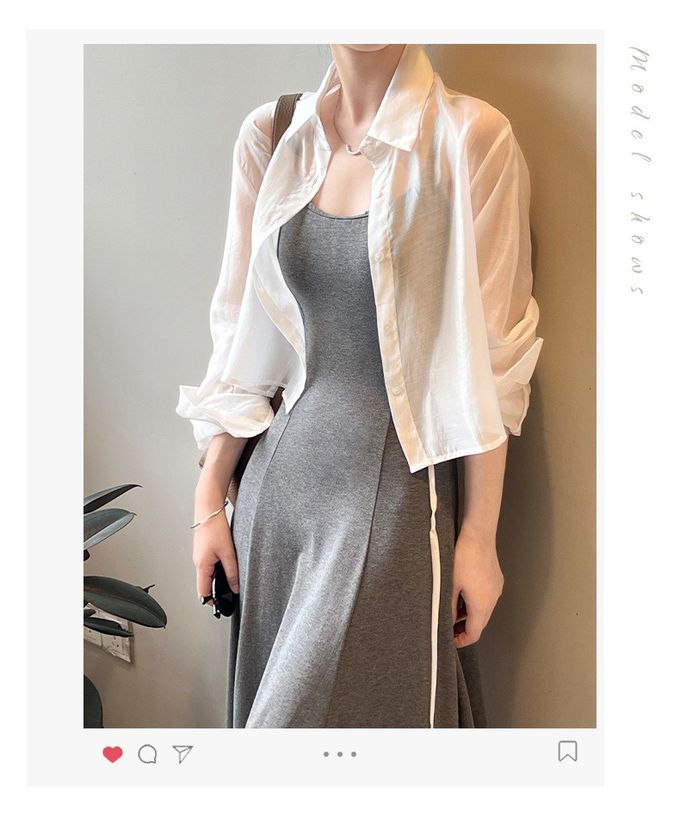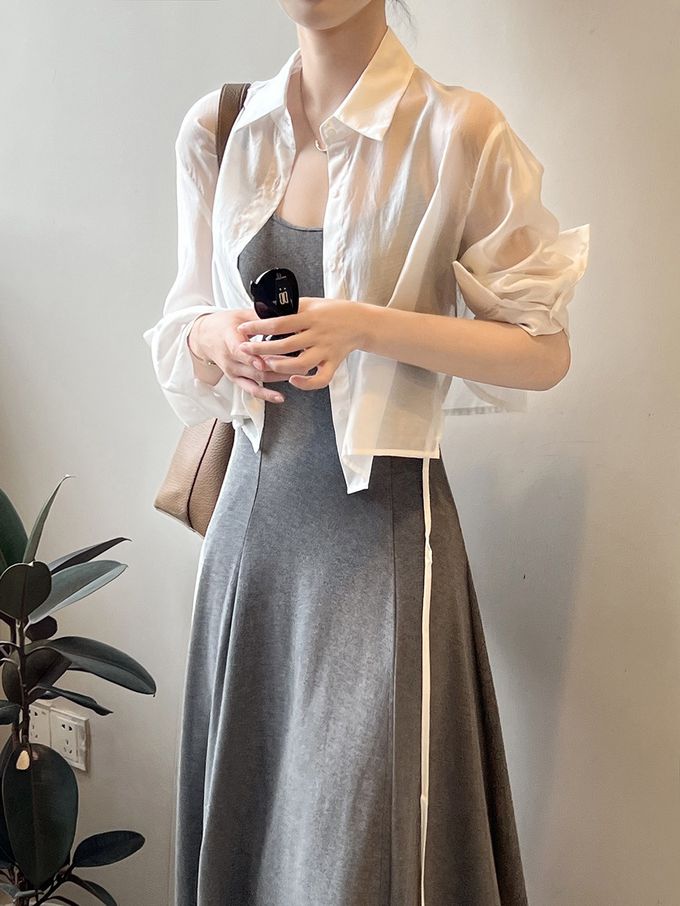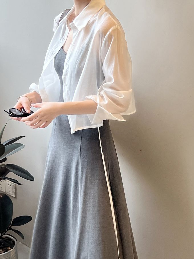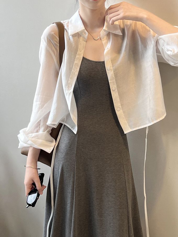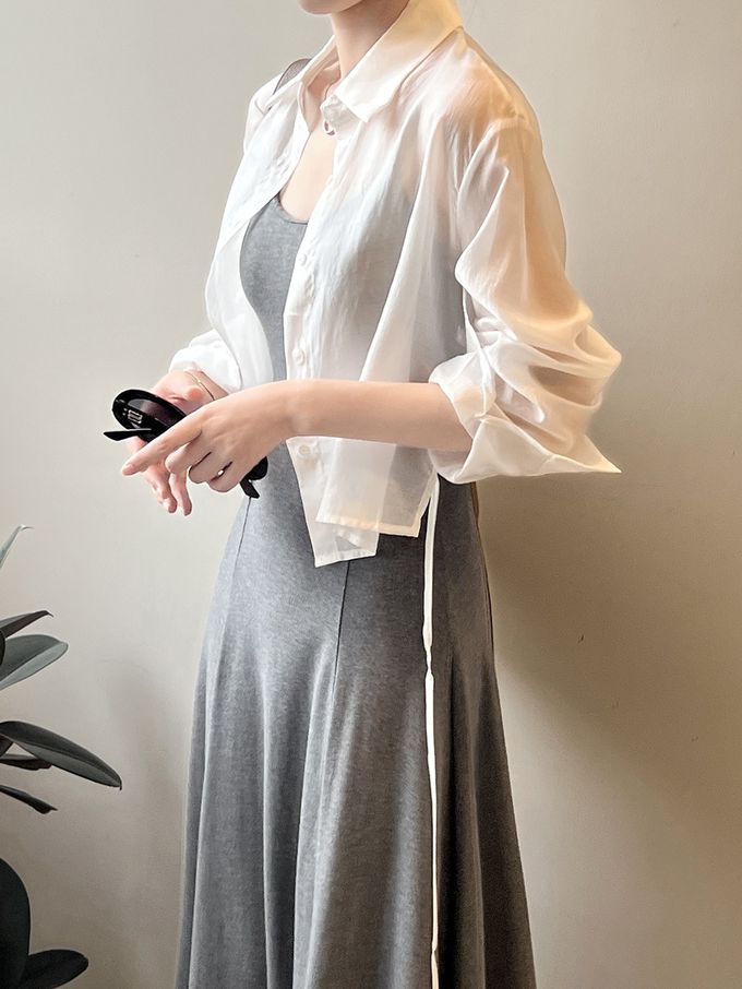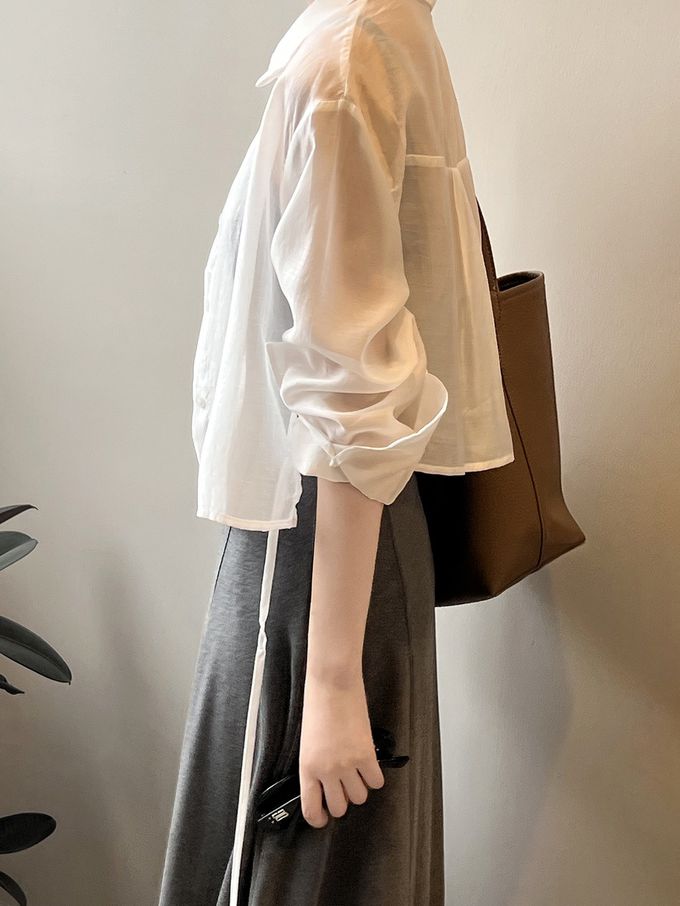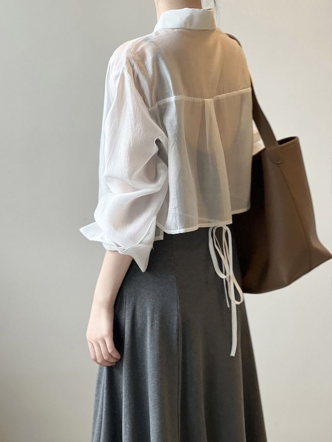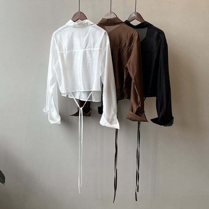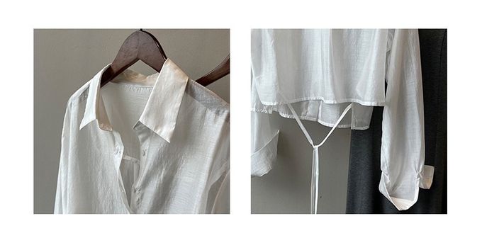 YANSOO - 透膚感薄長袖襯衫-短版後綁帶-白色