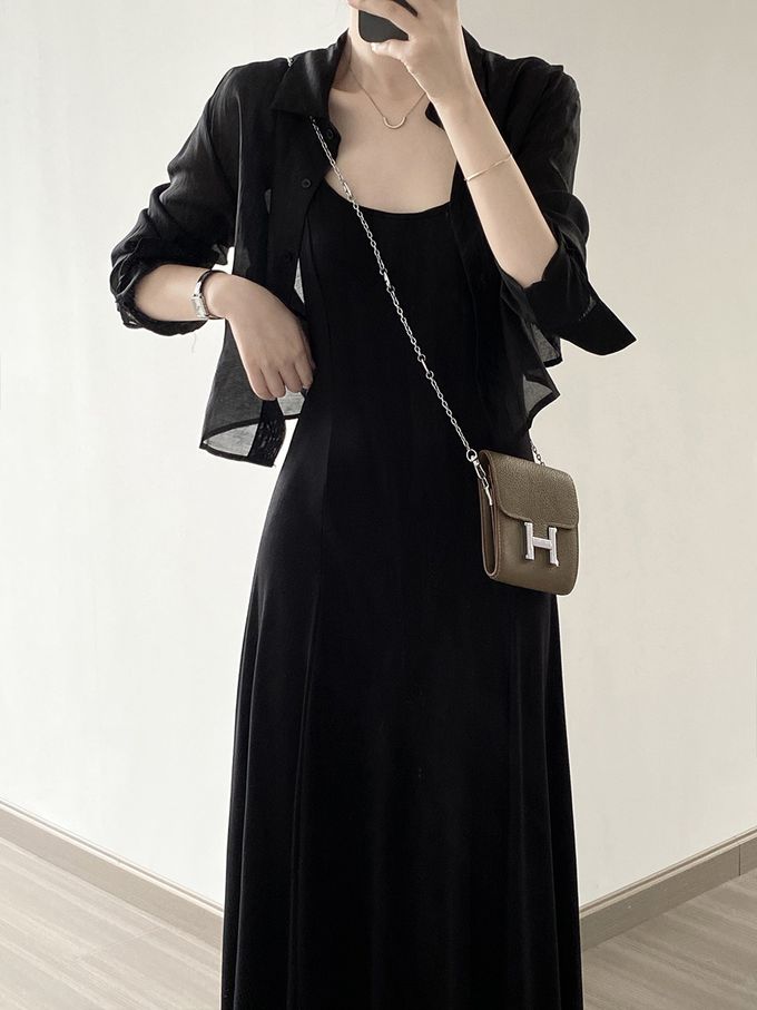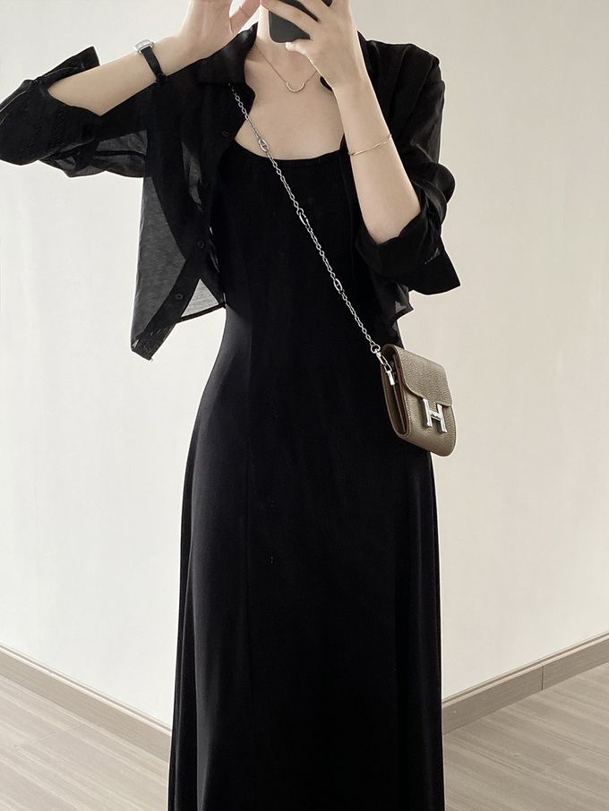 透膚感薄長袖襯衫-短版後綁帶-黑色