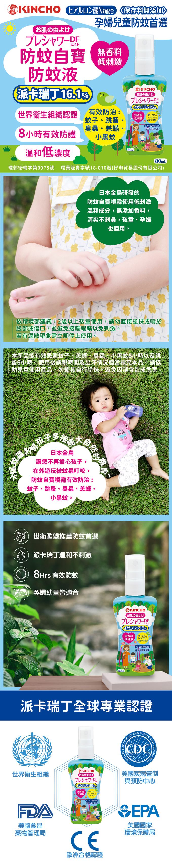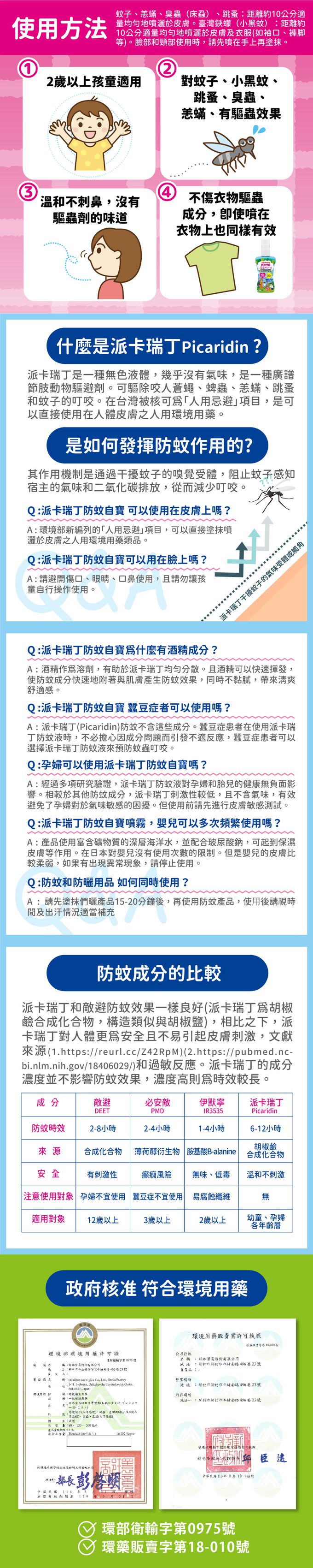 2.本產品能有效忌避蚊⼦、恙蟎、臭蟲、⼩⿊蚊8⼩時以及跳蚤6⼩時。使⽤後請視時間及出汗情況適當補充本品。請協助兒童使⽤產品,勿使其⾃⾏塗抹,避免因誤食造成危害。