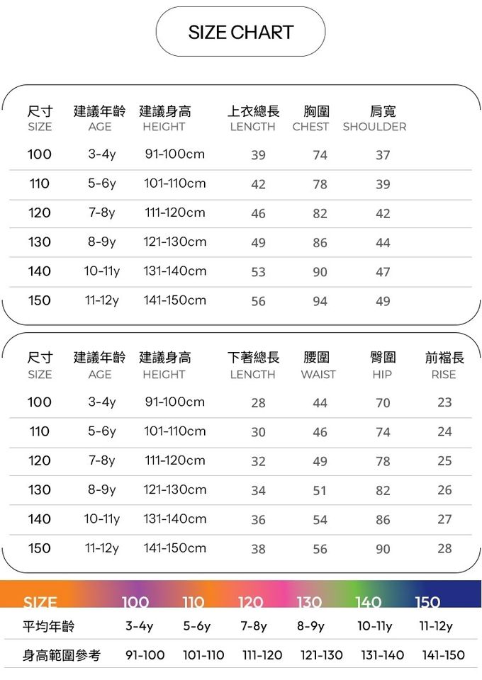 1. 尺寸表單位皆為公分(cm),實際尺寸會因布料彈性、水洗、測量起迄點等因素略有誤差。建議參考孩子平時穿著衣物尺寸進行選購。