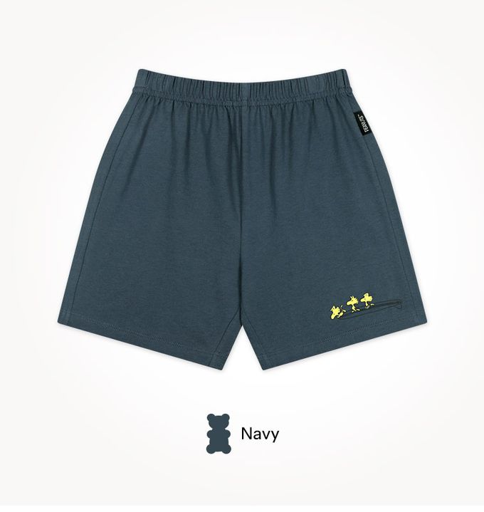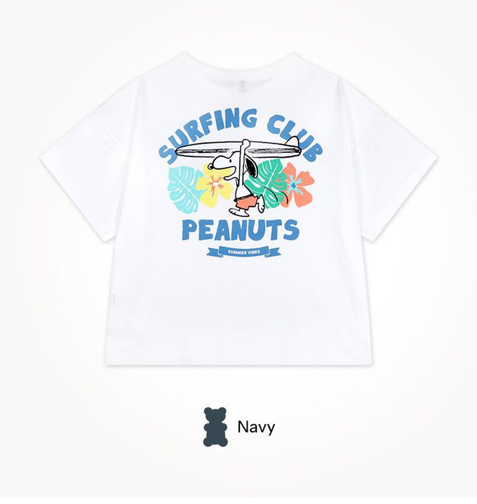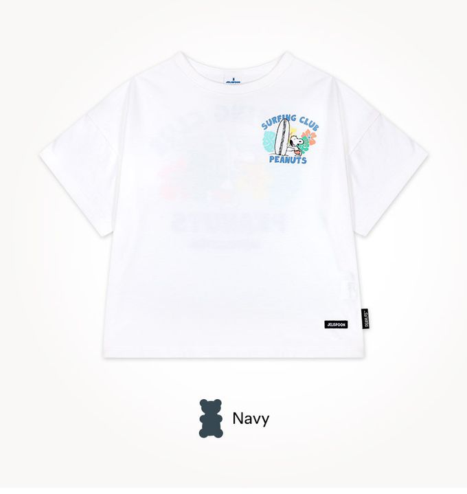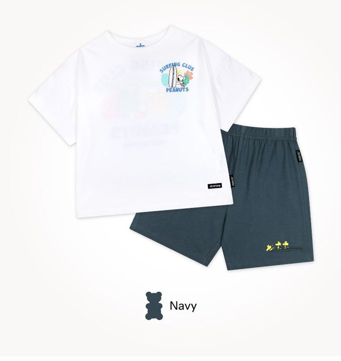 韓國 Jelispoon - (聯名款)衝浪圖案純棉短袖套裝-卡通人物史努比-白X深灰藍