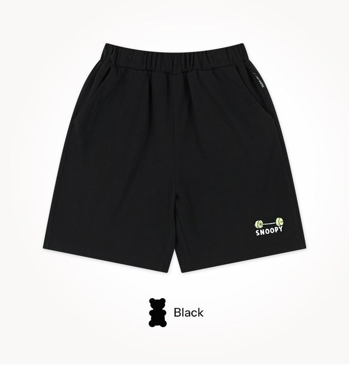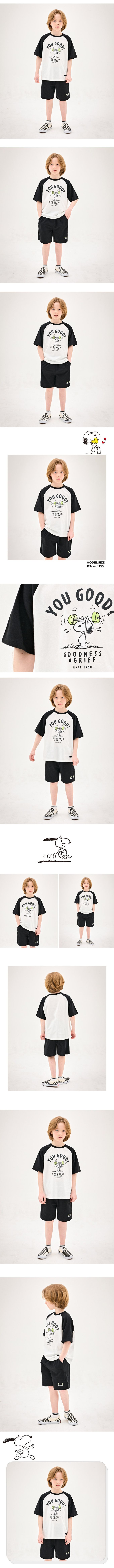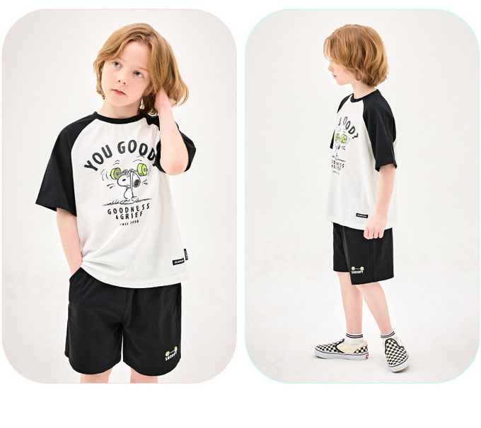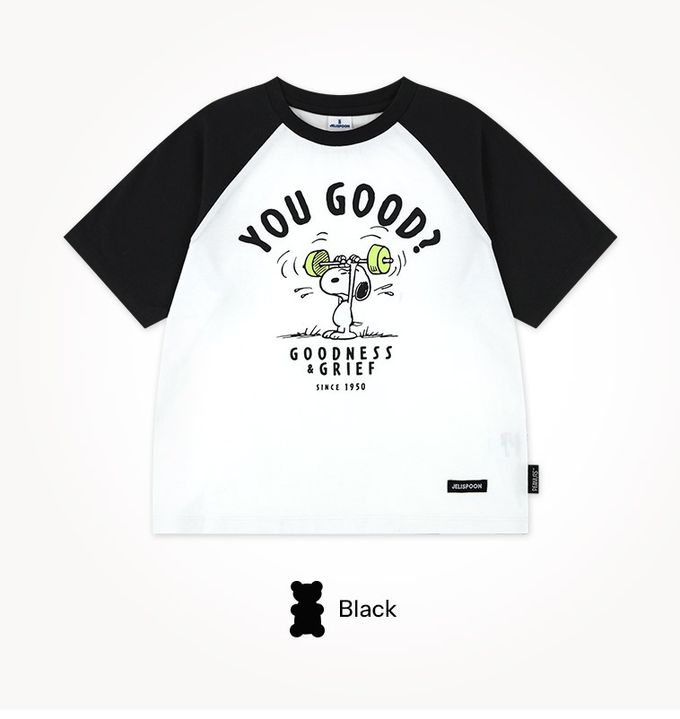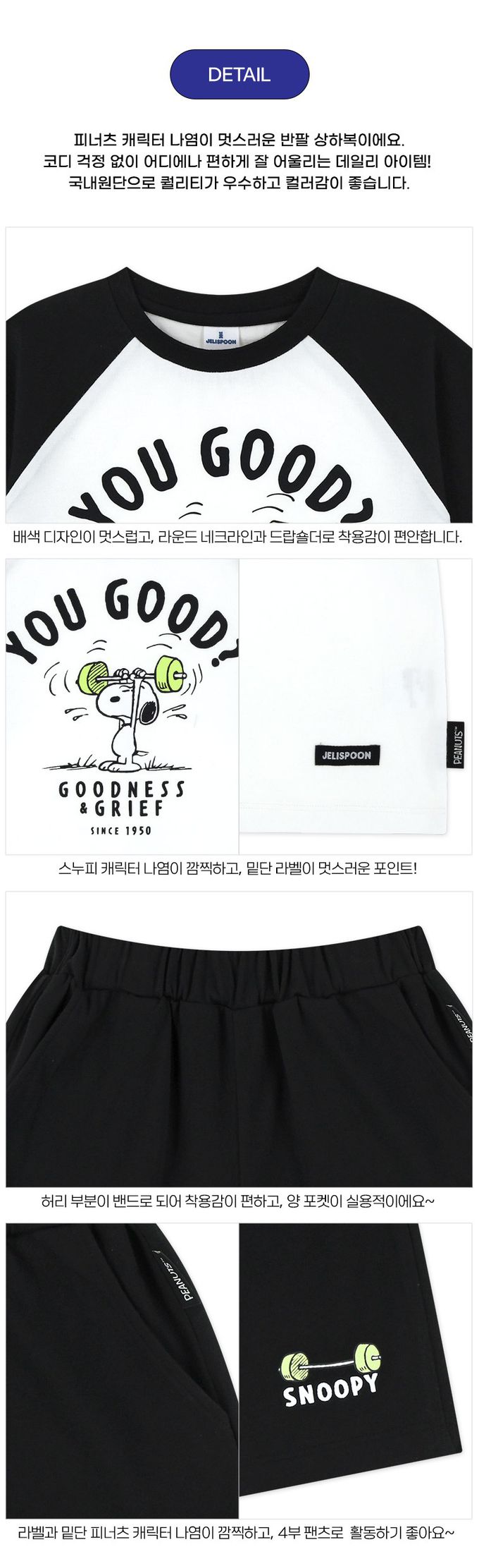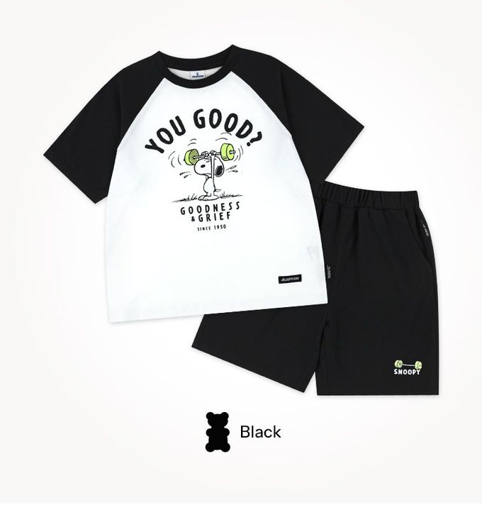韓國 Jelispoon - (聯名款)舉重圖案純棉短袖套裝-卡通人物史努比-白X黑