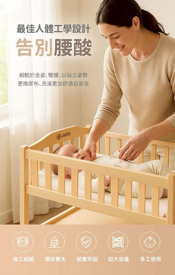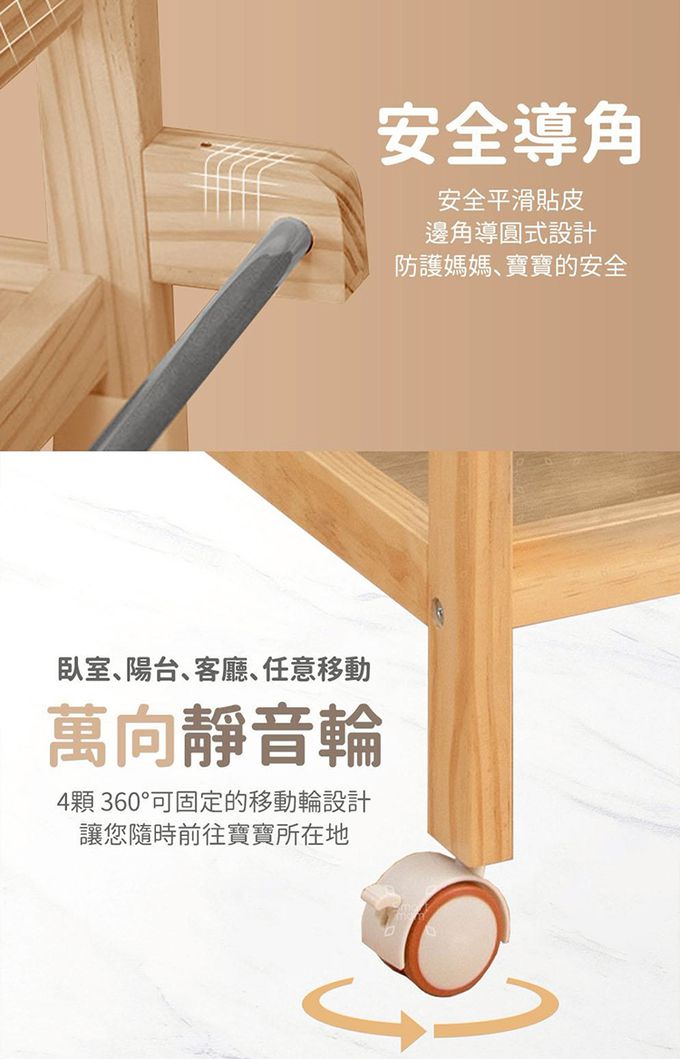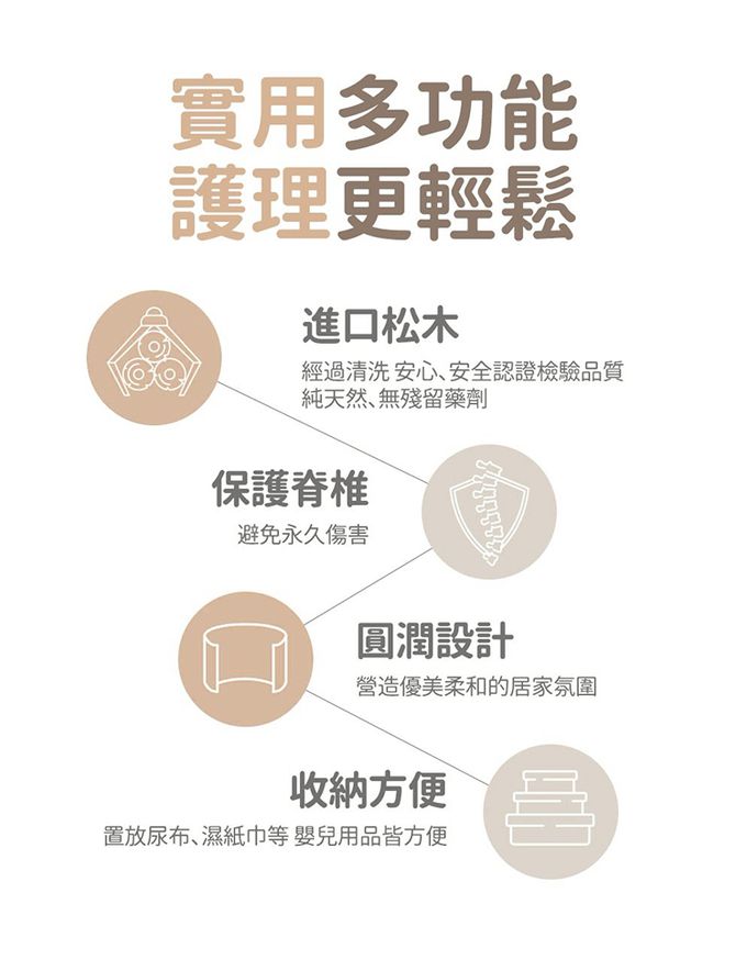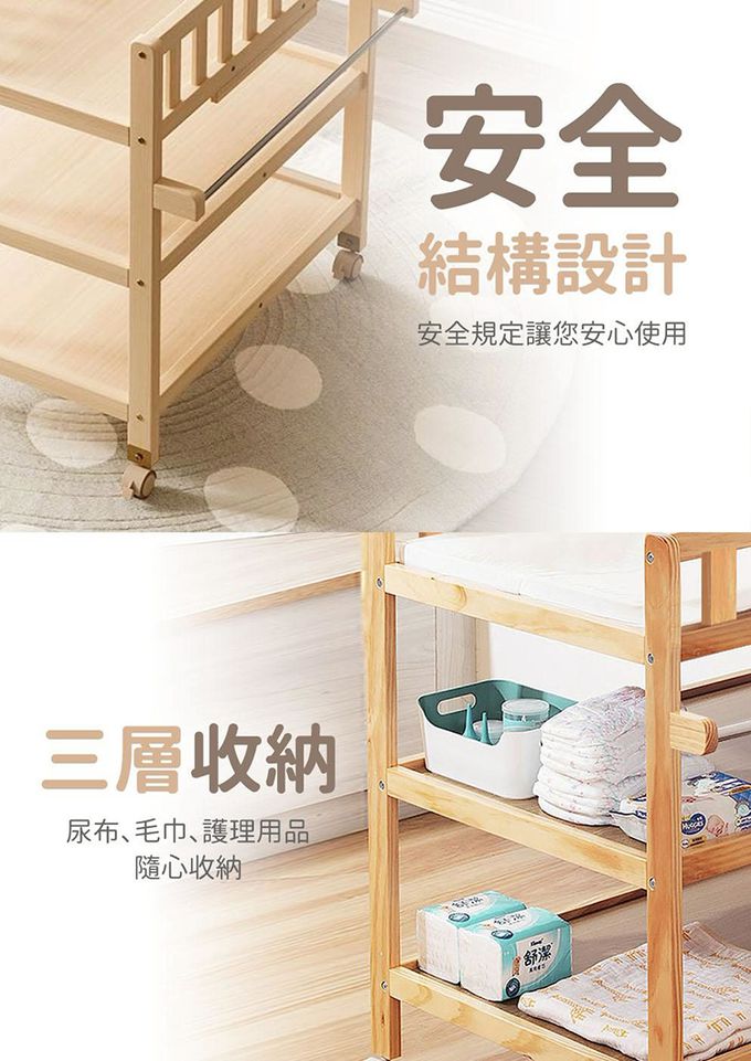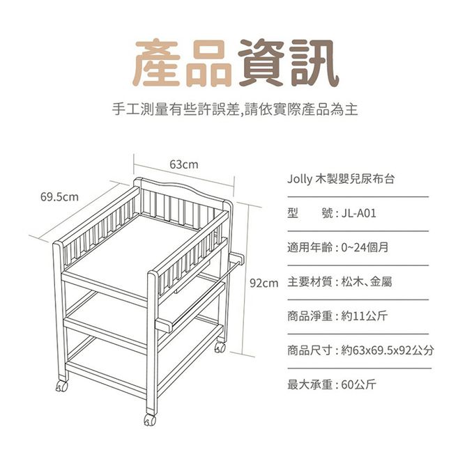 注意事項:適用年齡:0~24個月 最大承重:60kg 主要材質:松木、金屬 商品尺寸:約 63x69.5x92cm 商品淨重:約 11kg 產地:中國 【注意事項】 ● 本產品一次僅供一位嬰幼兒使用。 ● 切勿單獨留置嬰幼兒無成人照顧。 ● 請小心小零件,避免窒息的危險 ● 防止嬰幼兒站立於產品上,造成跌落危險。 ● 本產品僅供嬰幼兒更換尿布,切勿當作床使用 ● 注意火源及其他熱源,例如附近的電器、瓦斯等風險。 ● 不允許任意修改,修改後可能會减低產品的安全性造成危險。 ● 本產品不適用於樓梯間、高處、高低不平地帶等易傾倒之場合使用。 ● 使用前請檢查所有鎖定裝置,確保所有鎖定裝置和螺絲皆有鎖定咬合。 ● 為避免嬰兒或兒童產生窒息之危險,請於拆卸後立即將塑膠袋銷毁或遠離嬰兒及兒童。 ● 手工量測有些許誤差,請依實際產品為主。