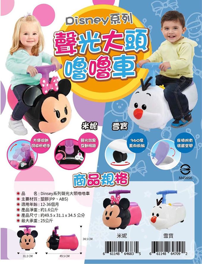 注意事項:適用年齡:12~36個月 最大承重:25kg 主要材質:塑膠(PP、ABS) 產品尺寸:約 49.5x31.1x34.5cm 產品淨重:約 1.6kg 產地:中國 商品檢驗標識號:M45656 【注意事項】 ● 本產品不適合1歲以下兒童 ● 請勿在晚上能見度低時使用 ● 使用本產品時,需有成人在旁監護 ● 使用時不容許用自行車、汽車或者其他車拖行。 ● 使用前請完整閱讀使用說明書,必需由成人組裝。 ● 內含小零件及塑膠袋,避免吞食、窒息之危險。 ● 本產品限一人騎乘,最大承重為25公斤,嚴禁超載使用。 ● 不允許任意修改,修改後可能會减低產品的安全性造成危險。 ● 本產品使用2顆3號1.5V(AA)電池,商品不含電池,需自行購買。 ● 使用本產品請穿戴符合安全規範的防護裝備(安全帽、護膝和護肘及包鞋)。 ● 使用需要一些技巧,以避免跌倒或碰撞而引致使用者或第三方受傷。 ● 使用前請檢察所有鎖定裝置,確保所有鎖定裝置和螺絲皆有鎖緊咬合。 ● 為避免嬰兒或兒童產生窒息之危險,請於拆卸後立即將此塑膠袋銷毀或遠離嬰兒及兒童。 ● 禁止於公共道路、易翻車場合、高低不平、樓梯、自動扶梯、水池、碎石路面丶斜坡、坡道等危險場所使用。