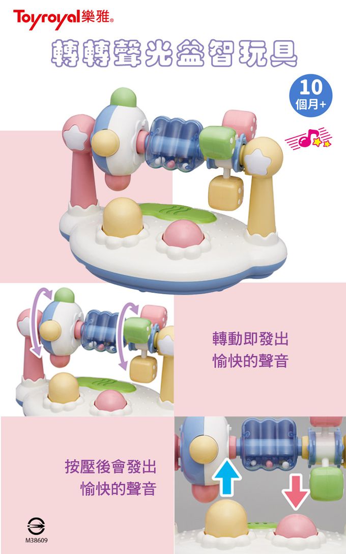 注意事項:適用年齡:10個月以上(不適用10個月以下) 主要材質:ABS 產地:中國 商品檢驗標識號:M38609 【注意事項】 ● 勿用酒精及熱水清潔消毒,避免塑膠溶化變質,請用溫水擦拭清潔。 ● 玩具如有電子零件或發音器零件,勿於水龍頭底下沖洗或直接泡入水中,以免零件損壞及生鏽。 ● 詳細產品清潔方式及使用說明,請參看官方網站 www.toyroyal.com.tw。 ● 請於拆卸後立即將塑膠袋銷毀或遠離嬰幼童,以避免兒童產生窒息之危險。 ● 内如附有線、繩、綁帶等玩具,請防止可能纏結孩童頸部造成窒息傷害,請在成年人監護下玩耍。 ● 玩具如有破損或斷裂,請勿再讓孩童玩耍,以免割傷及避免幼童誤吞小物件,造成嚴重傷害。 ● 此玩具需要安裝電池,如長期不使用時,請記得將電池拔出,以免電池漏液損壞玩具。