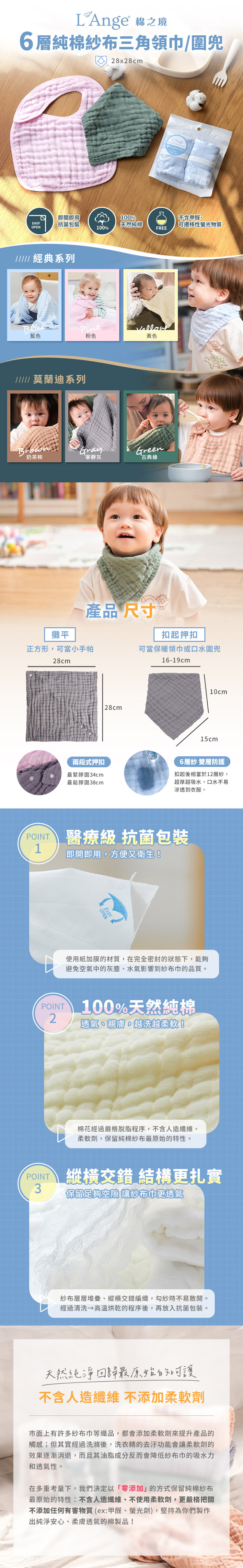 嚴選棉花及脫脂程序,縱橫交錯編織而成,吸水性極佳!可迅速吸收口水、溢奶。